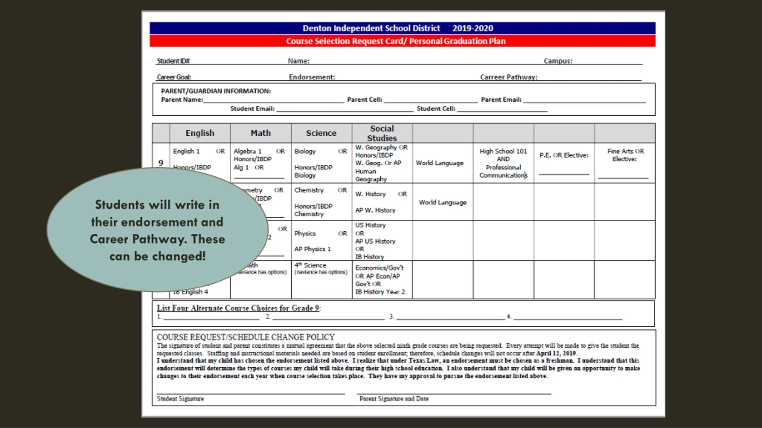 Students will write in their endorsement and Career Pathway. These can be changed!