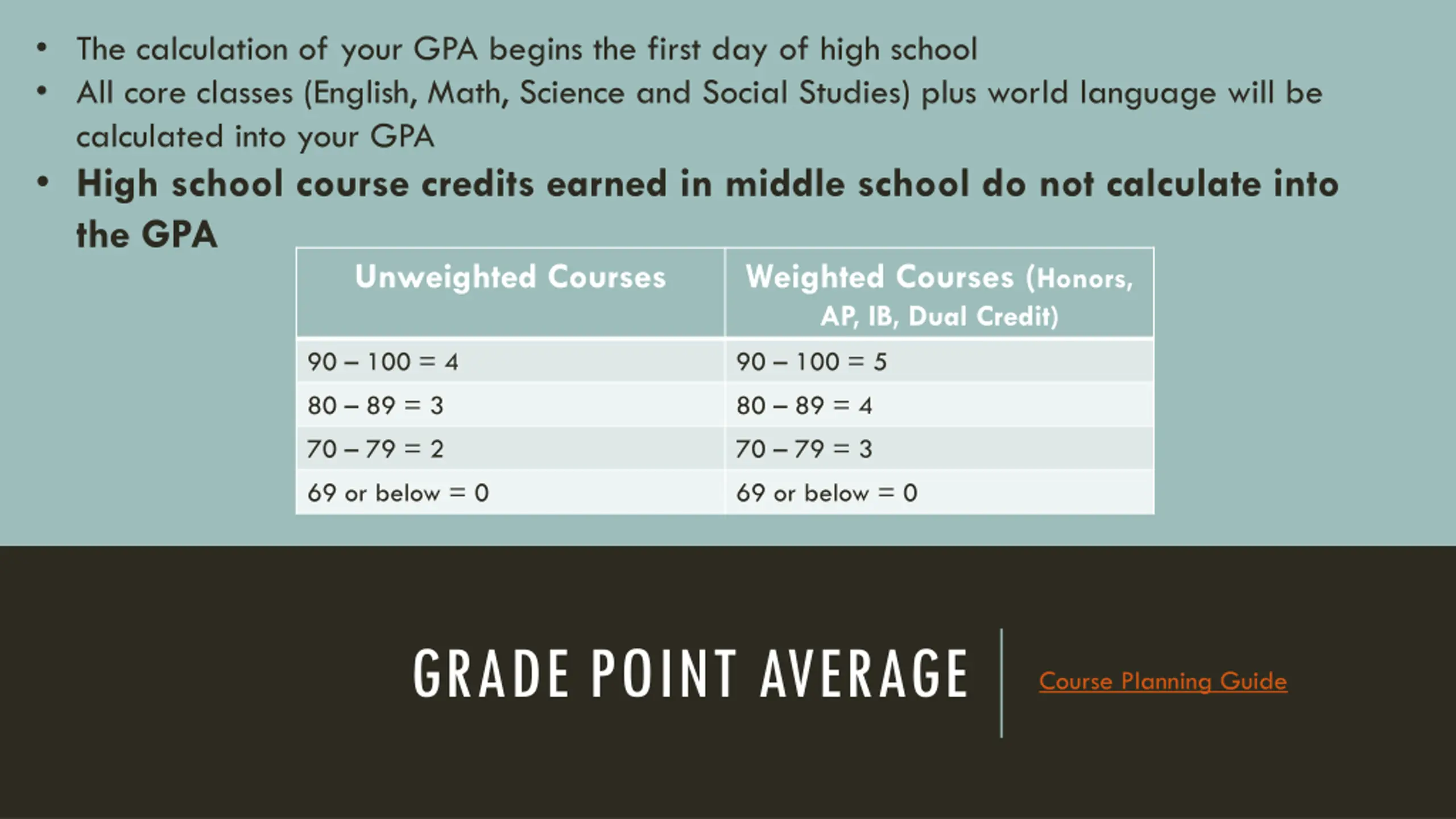 The calculation of your GPA begins the first day of high school All core classes (English, Math, Science and Social Studies) plus world language will be calculated into your GPA High school course credits earned in middle school do not calculate into the GPA Unweighted Courses Weighted Courses (Honors, AP, IB, Dual Credit) 90 100 = 4 90 100 = 5 80 89 = 3 80 89 = 4 70 79 = 2 70 79 = 3 69 or below = 0 69 or below = 0 GRADE POINT AVERAGE Course Planning Guide