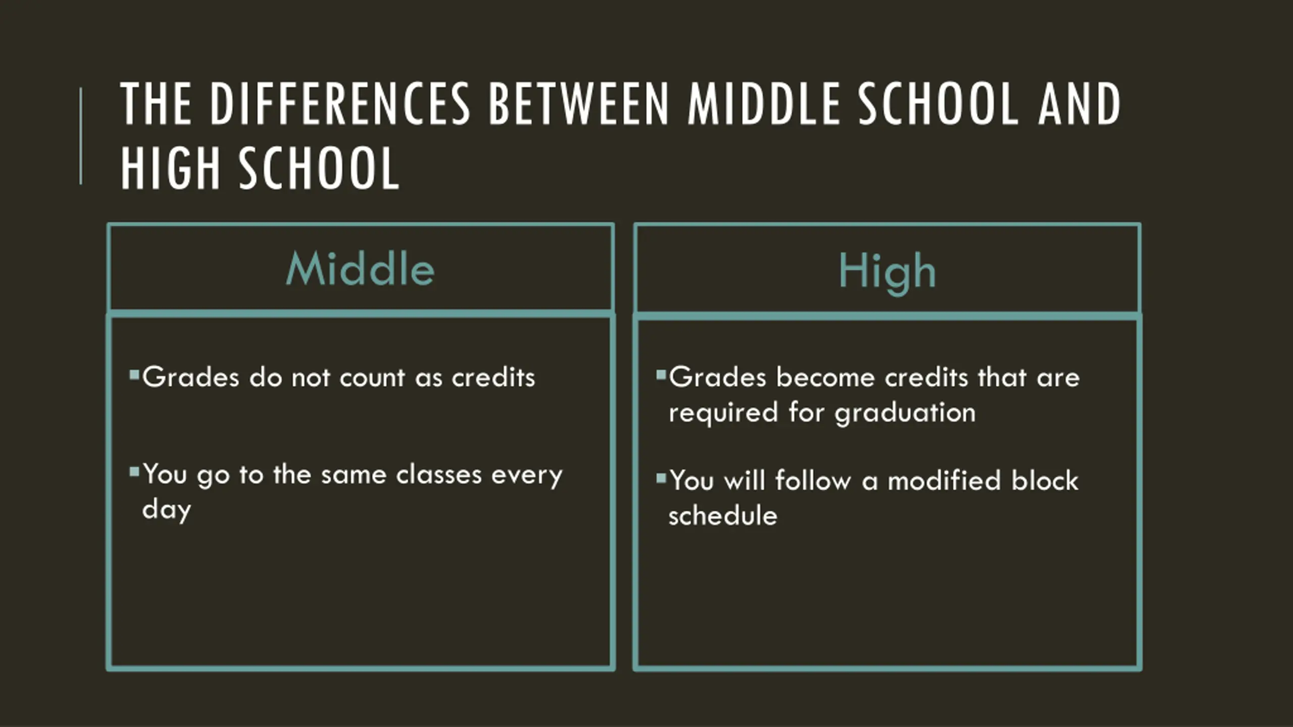 THE DIFFERENCES BETWEEN MIDDLE SCHOOL AND HIGH SCHOOL Middle High Grades do not count as credits Grades become credits that are required for graduation You go to the same classes every day You will follow a modified block schedule