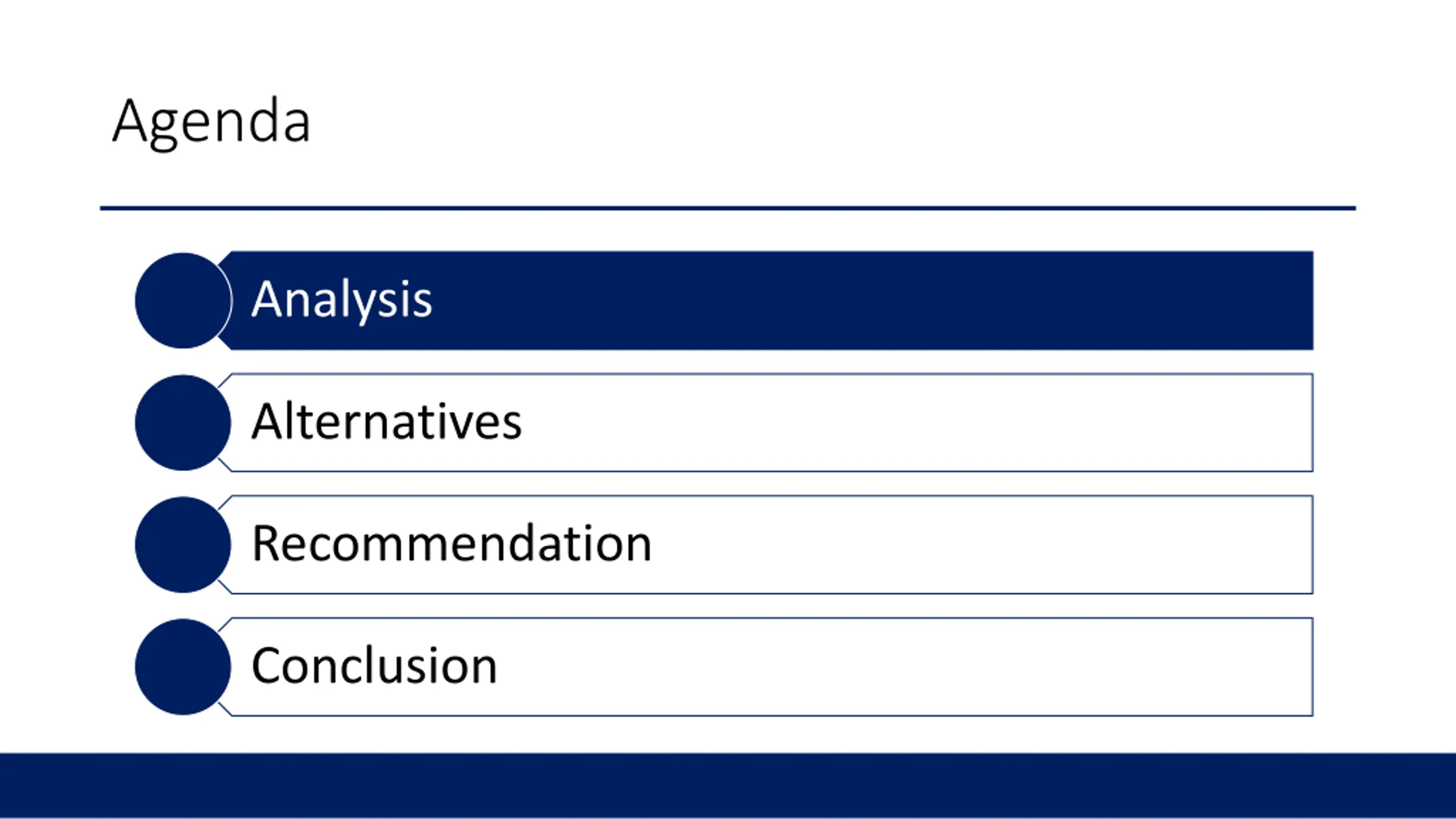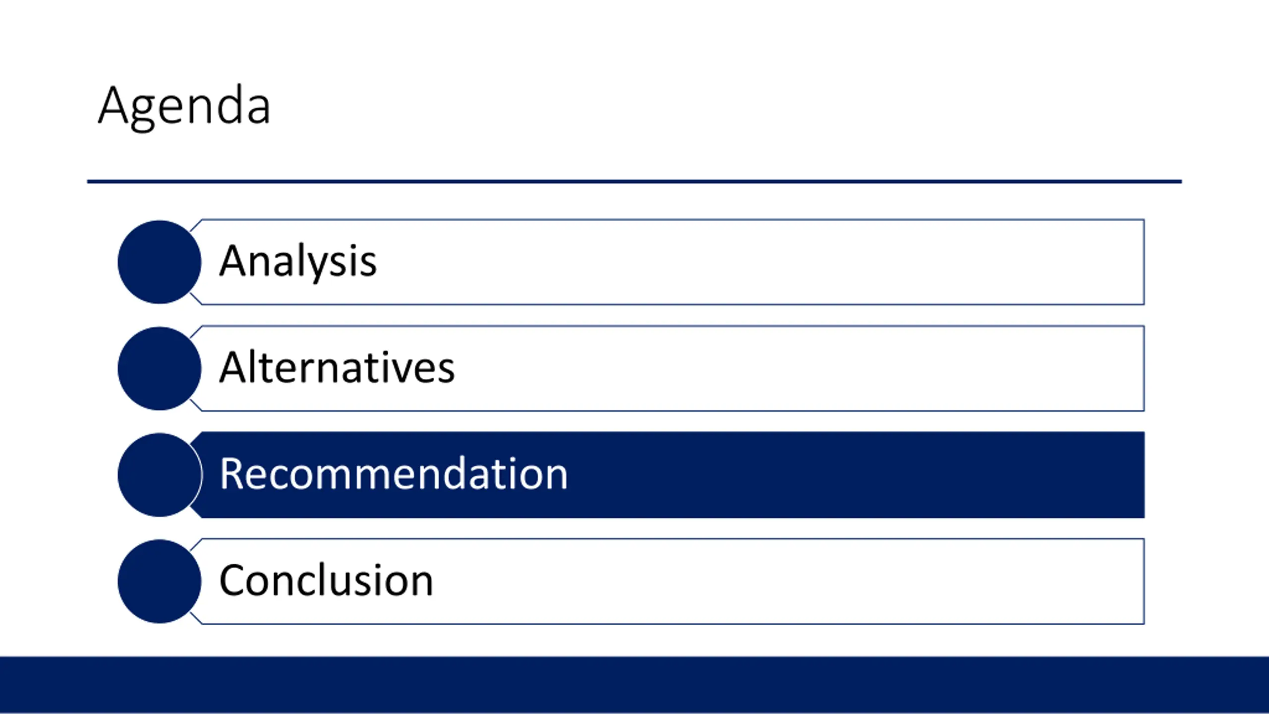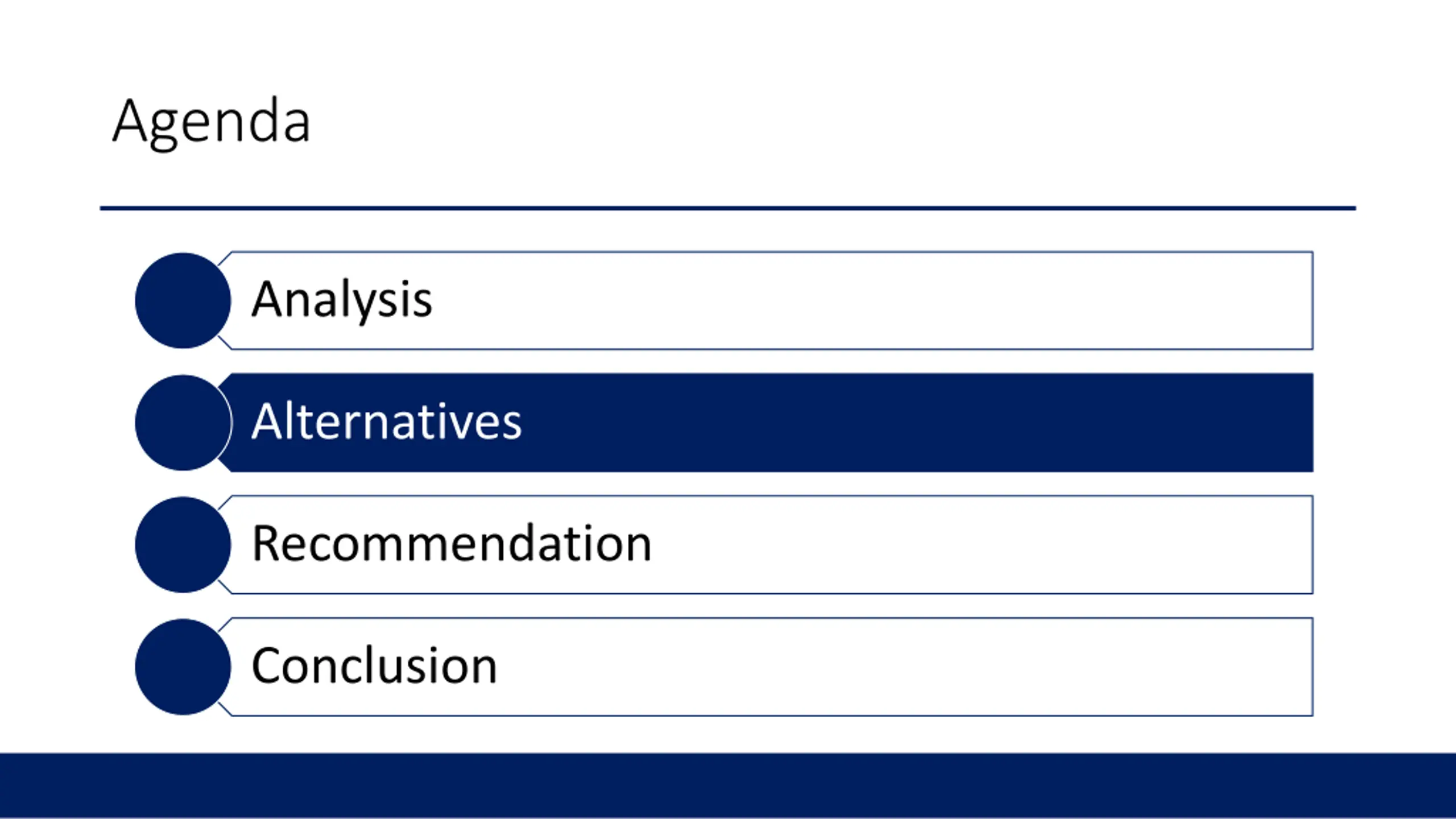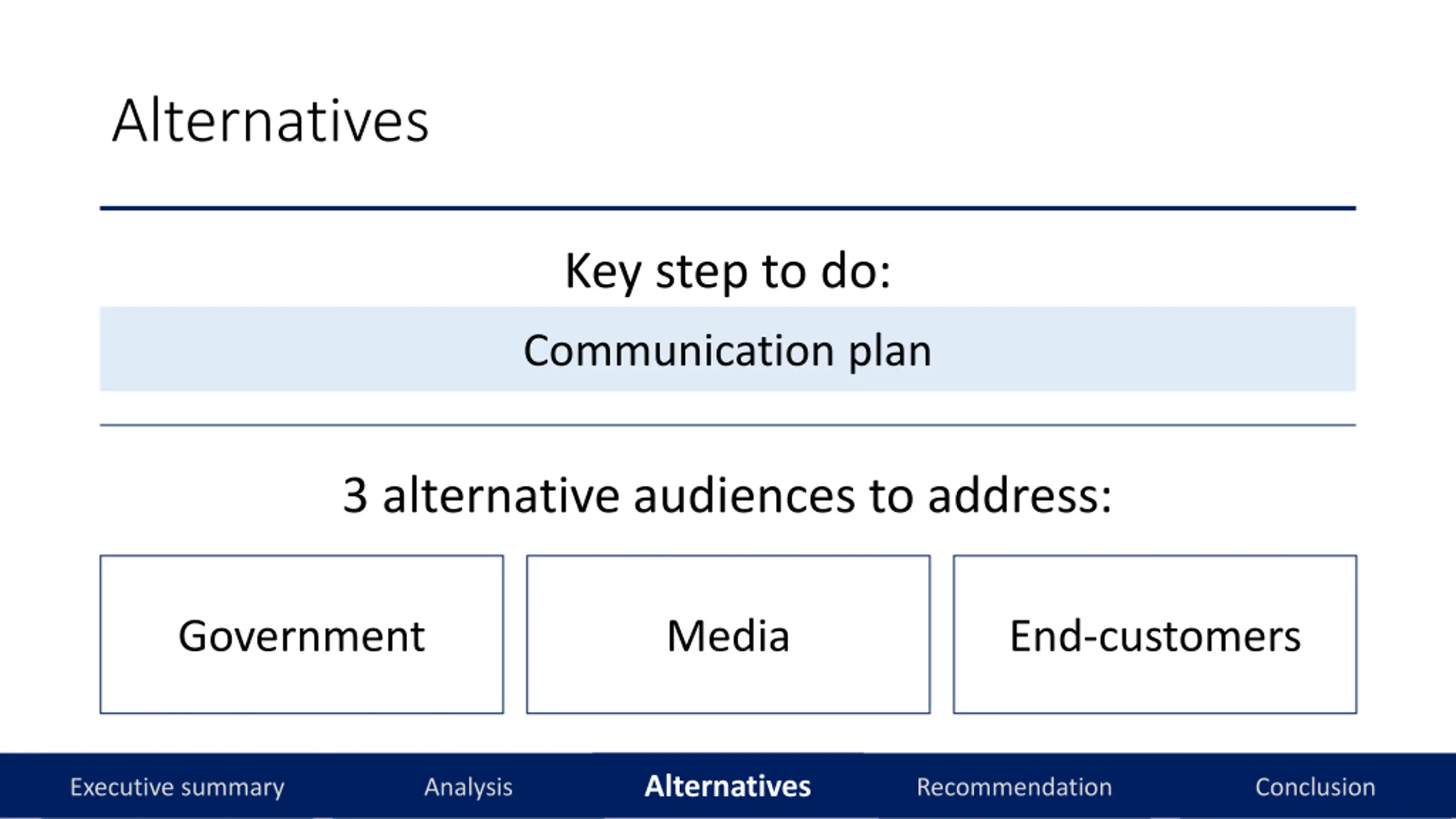 Alternatives Key step to do: Communication plan 3 alternative audiences to address: Government Media End-customers Alternatives Executive summary Analysis Recommendation Conclusion