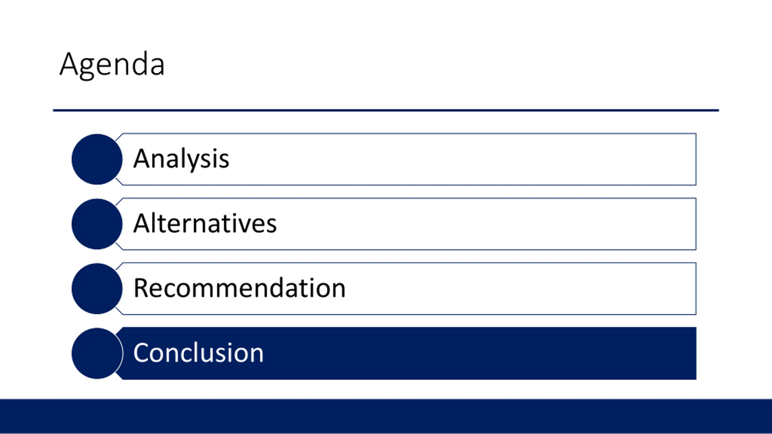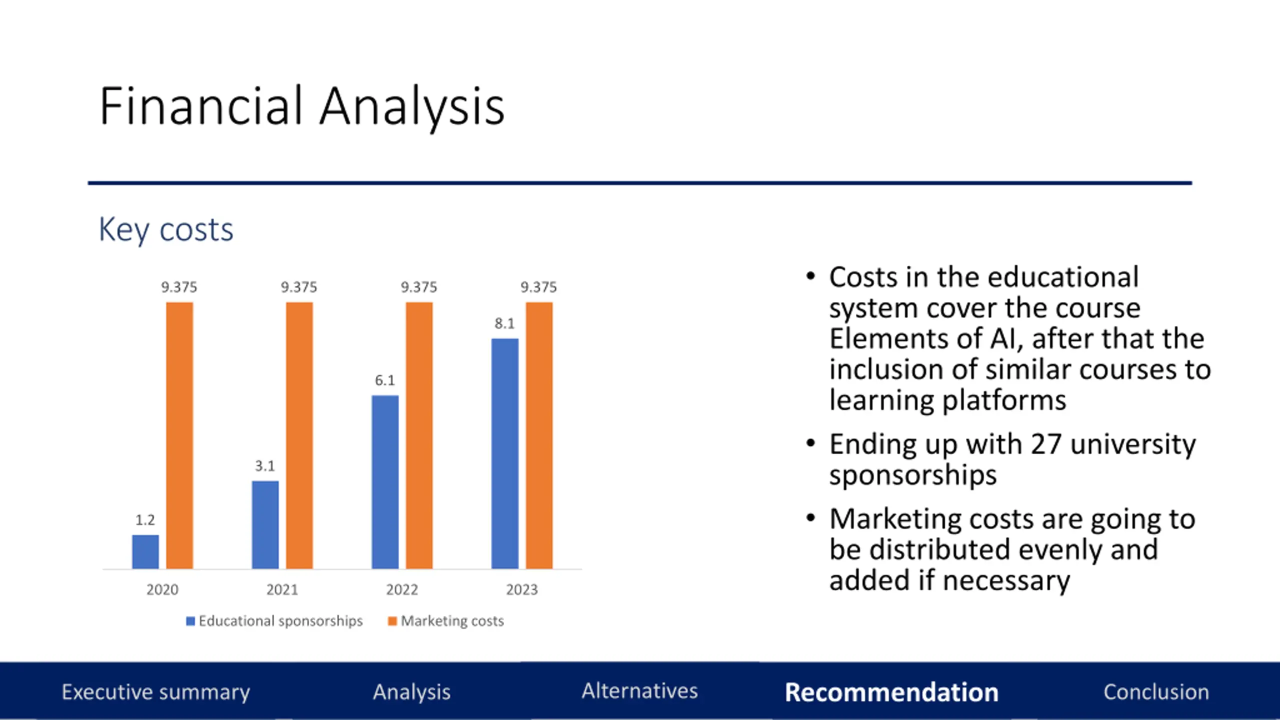 Financial Analysis Key costs Costs in the educational system cover the course Elements of AI, after that the inclusion of similar courses to learning platforms Ending up with 27 university sponsorships Marketing costs are going to be distributed evenly and added if necessary 9.375 9.375 9.375 9.375 8.1 6.1 3.1 1.2 2020 2021 2022 2023 Educational sponsorships Marketing costs Recommendation Alternatives Executive summary Analysis Conclusion