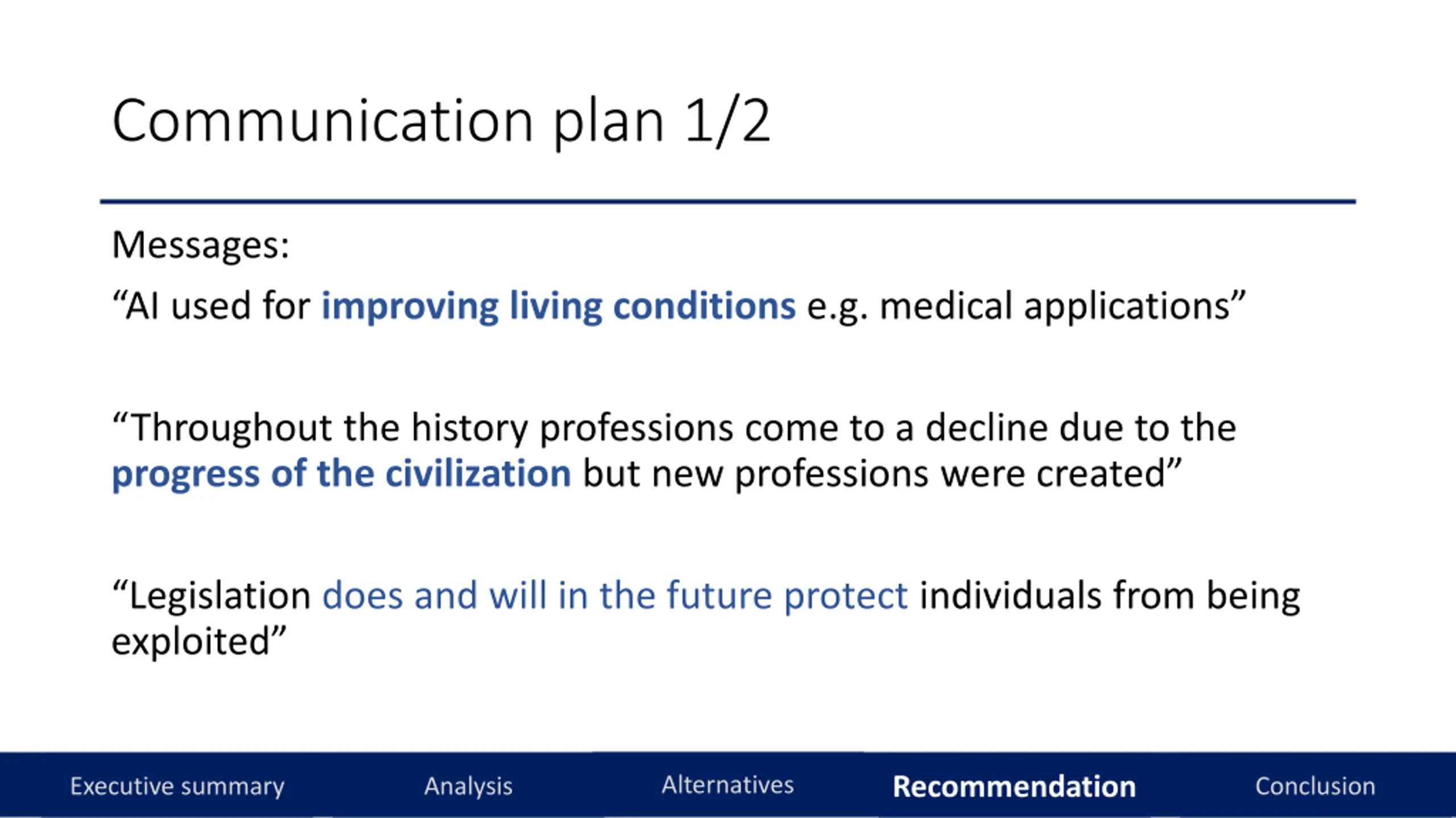 Communication plan 1/2 Messages: AI used for improving living conditionse.g. medical applications Throughout the history professions come to a decline due to the progress of the civilizationbut new professions were created Legislation does and will in the future protect individuals from being exploited Recommendation Alternatives Executive summary Analysis Conclusion