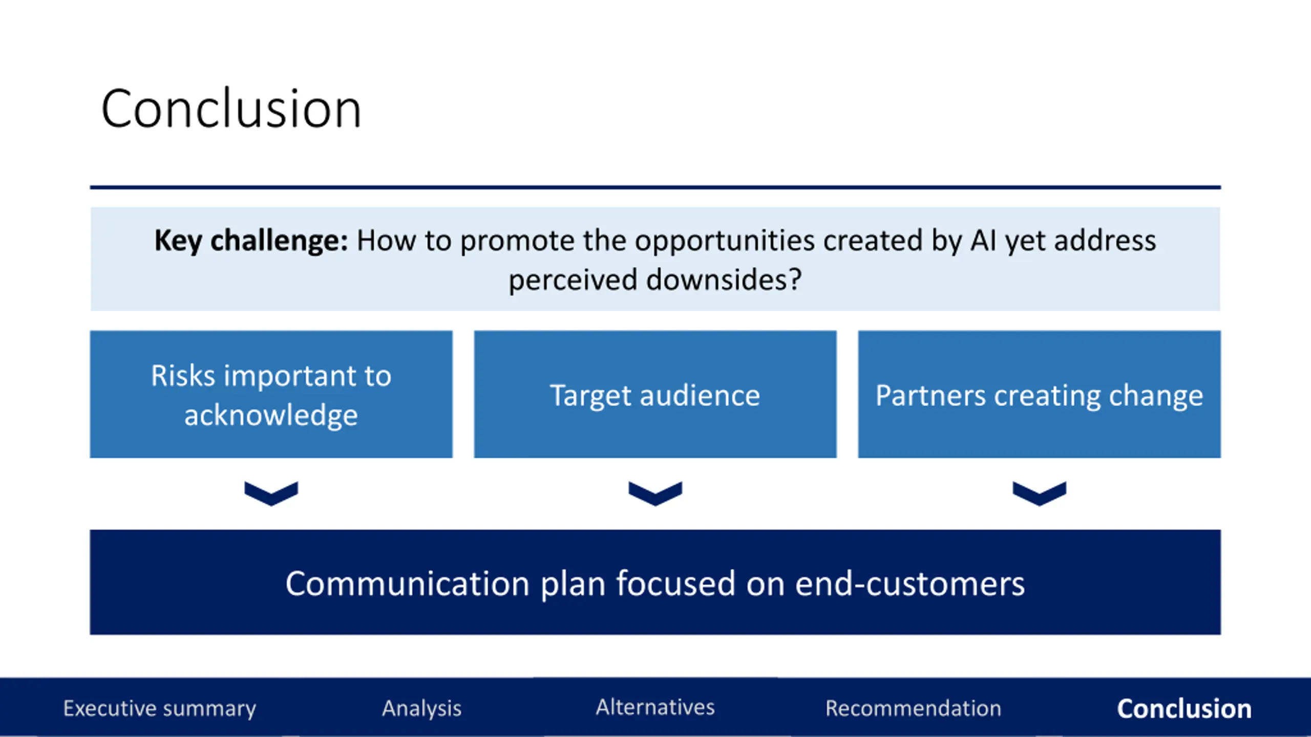 Conclusion Key challenge: How to promote the opportunities created by AI yet address perceived downsides? Risks important to acknowledge Target audience Partners creating change Communication plan focused on end-customers Conclusion Alternatives Executive summary Analysis Recommendation
