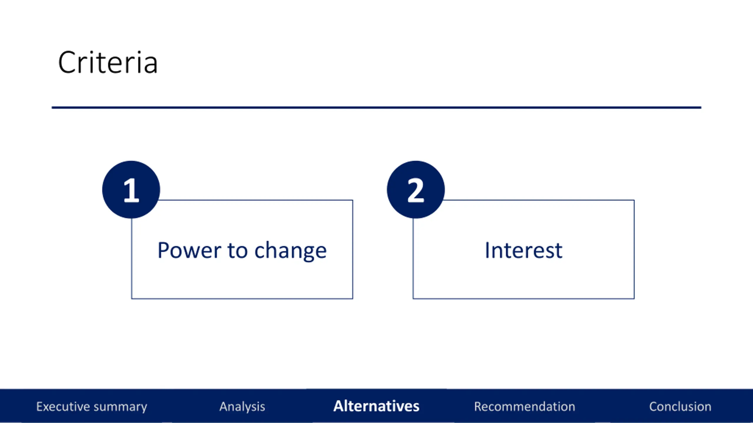 Criteria 1 2 Power to change Interest Alternatives Executive summary Analysis Recommendation Conclusion