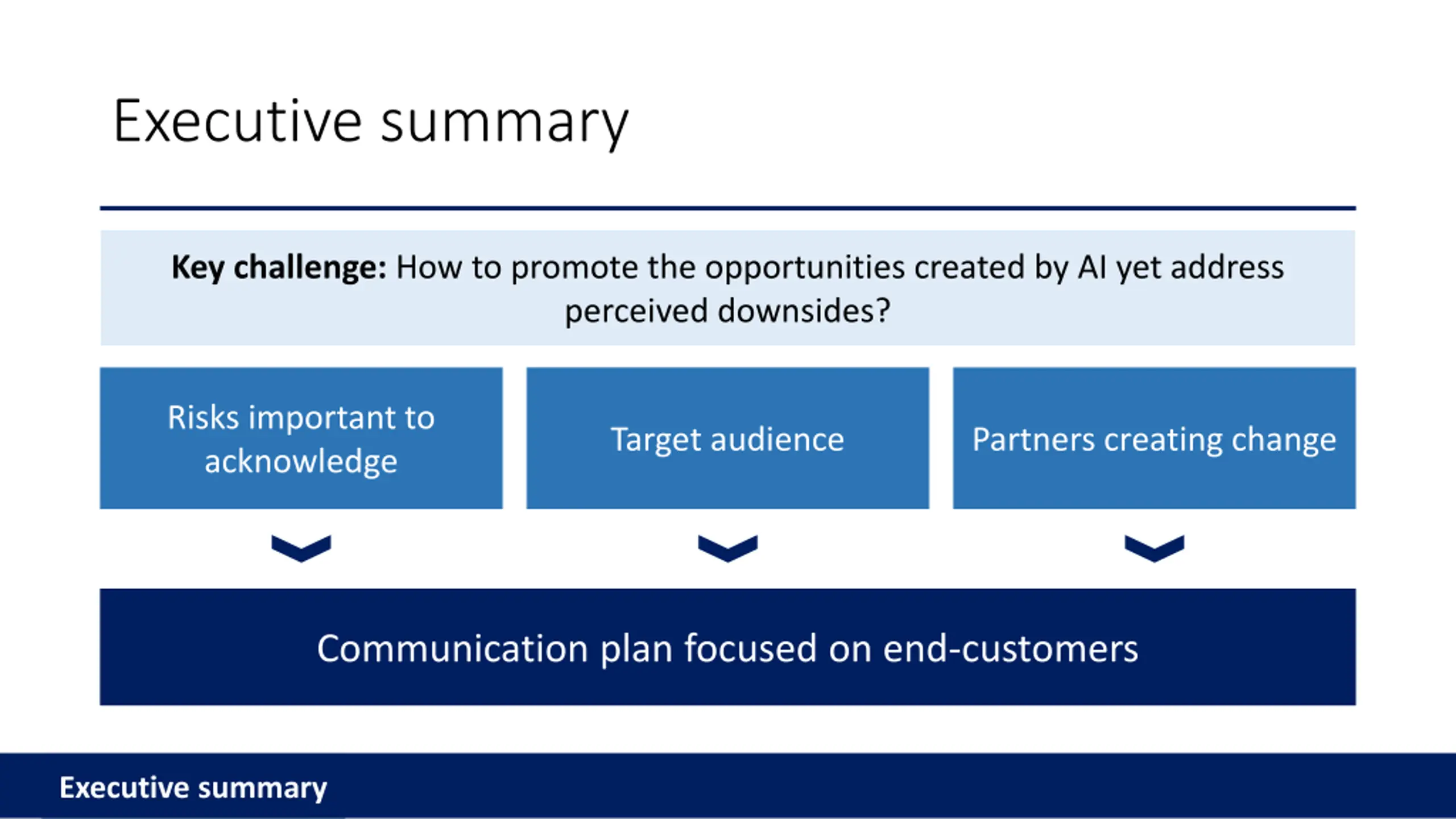 Executive summary Key challenge: How to promote the opportunities created by AI yet address perceived downsides? Risks important to acknowledge Target audience Partners creating change Communication plan focused on end-customers Executive summary