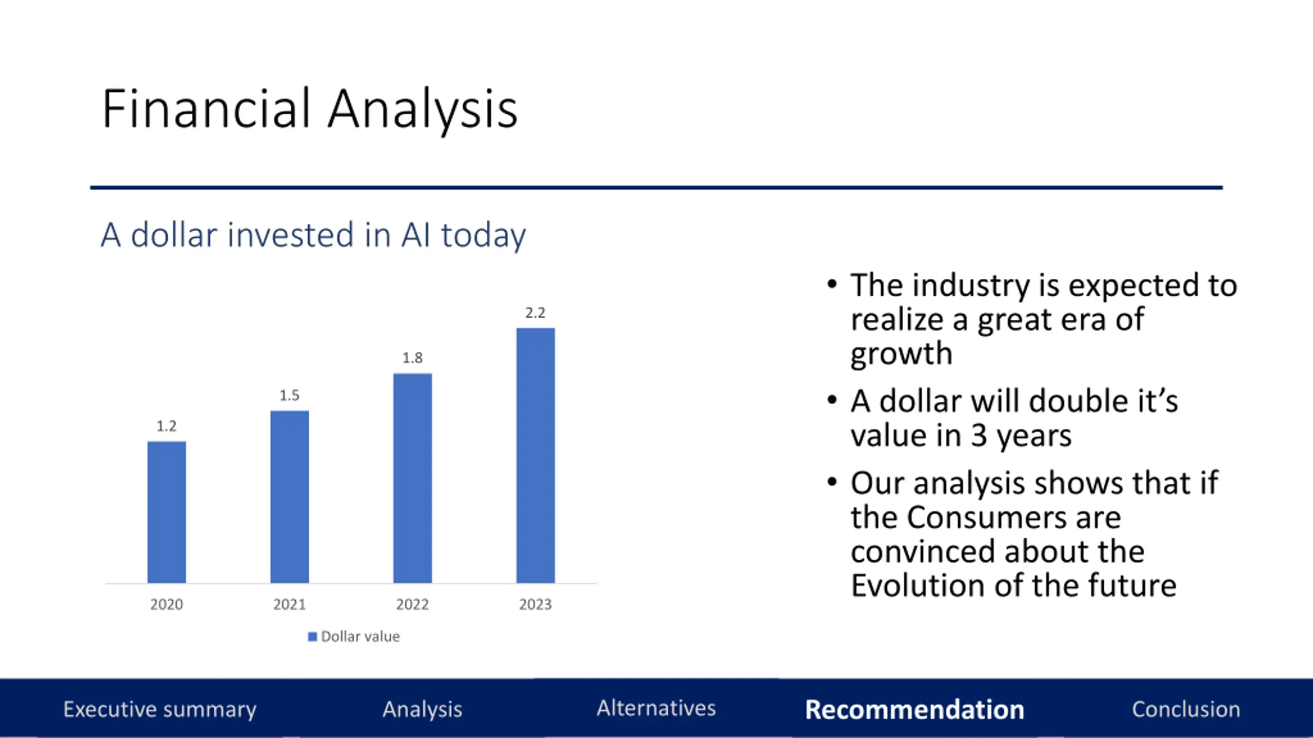 Financial Analysis A dollar invested in AI today The industry is expected to realize a great era of growth A dollar will double it s value in 3 years Our analysis shows that if the Consumers are convinced about the Evolution of the future 2.2 1.8 1.5 1.2 2020 2021 2022 2023 Dollar value Recommendation Alternatives Executive summary Analysis Conclusion