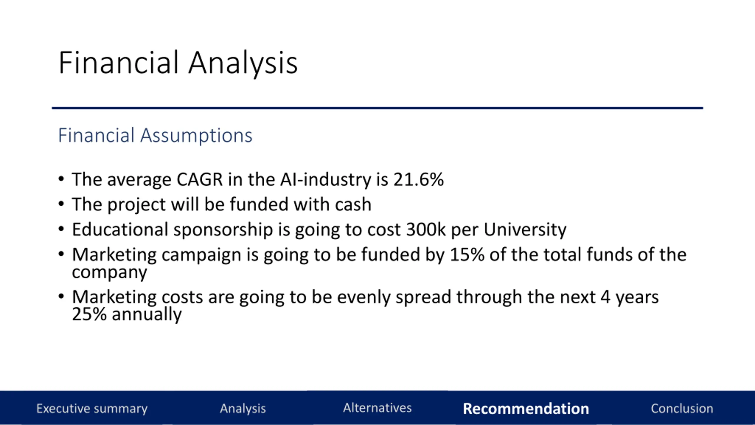 Financial Analysis Financial Assumptions The average CAGR in the AI-industry is 21.6% The project will be funded with cash Educational sponsorship is going to cost 300k per University Marketing campaign is going to be funded by 15% of the total funds of the company Marketing costs are going to be evenly spread through the next 4 years 25% annually Recommendation Alternatives Executive summary Analysis Conclusion