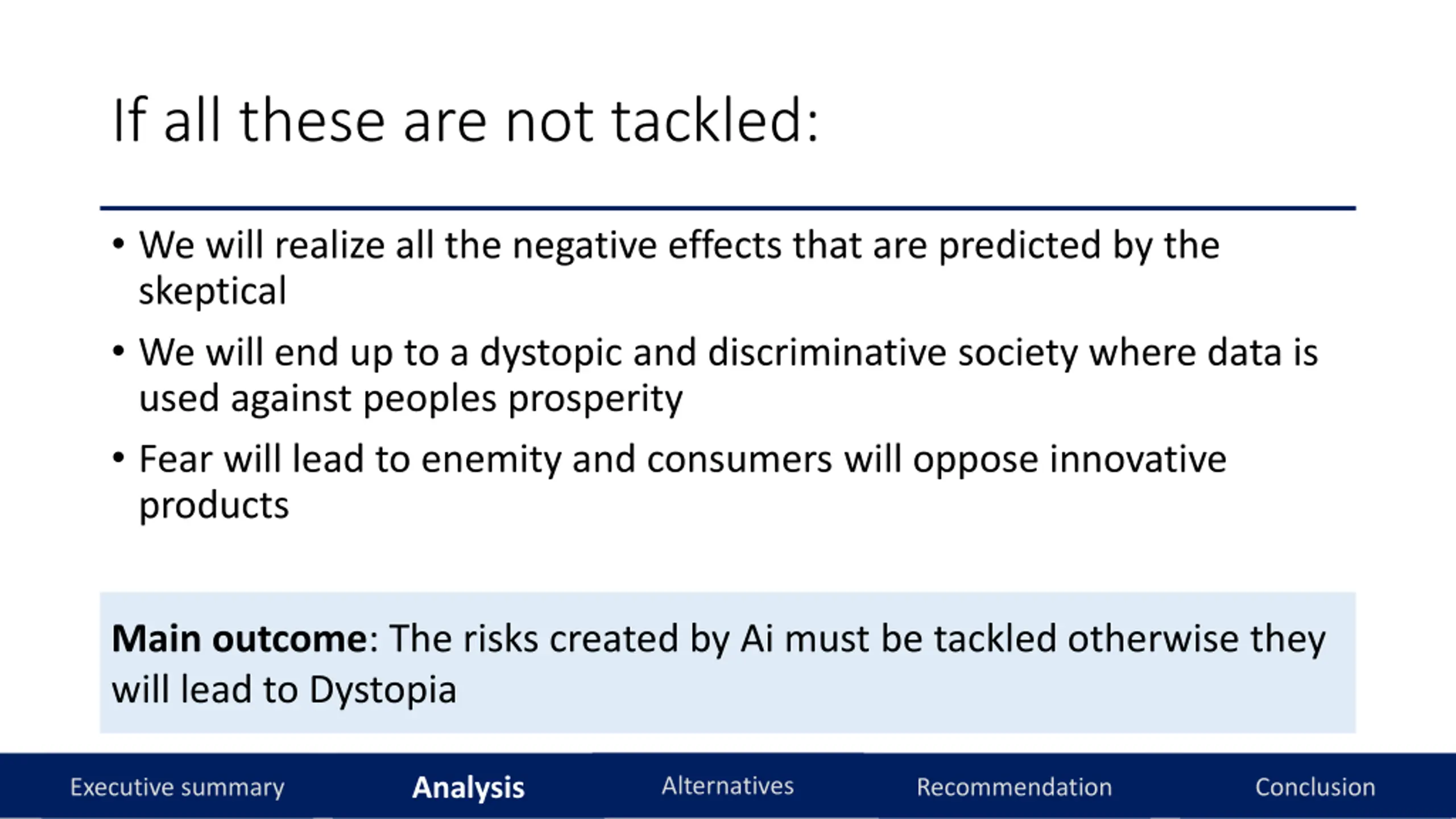 If all these are not tackled: We will realize all the negative effects that are predicted by the skeptical We will end up to a dystopic and discriminative society where data is used against peoples prosperity Fear will lead to enemity and consumers will oppose innovative products Main outcome: The risks created by Ai must be tackled otherwise they will lead to Dystopia Analysis Alternatives Executive summary Recommendation Conclusion