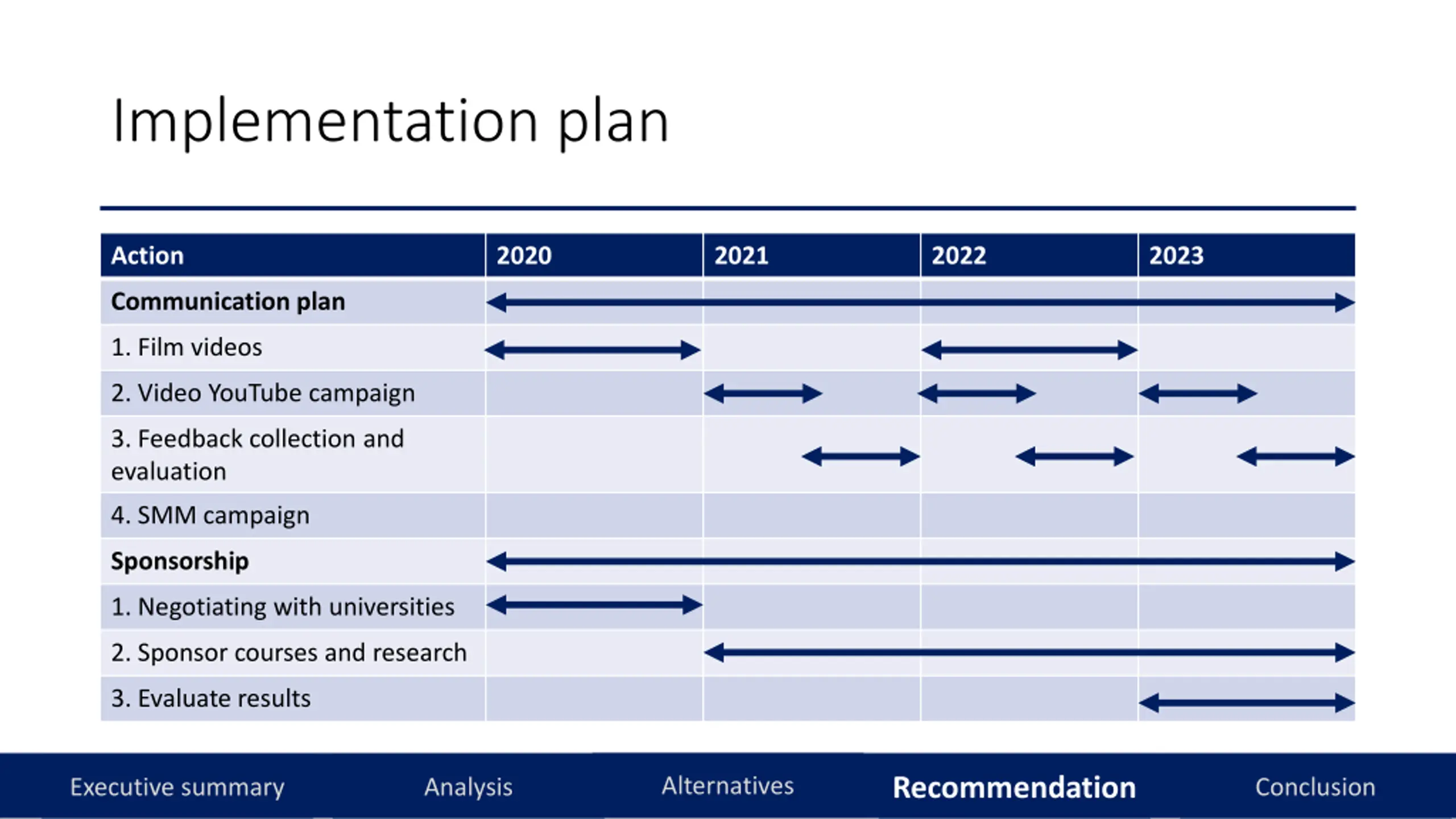 Implementation plan Action 2020 2021 2022 2023 Communication plan 1. Film videos 2. Video YouTube campaign 3. Feedback collection and evaluation 4. SMM campaign Sponsorship 1. Negotiating with universities 2. Sponsor courses and research 3. Evaluate results Recommendation Alternatives Executive summary Analysis Conclusion