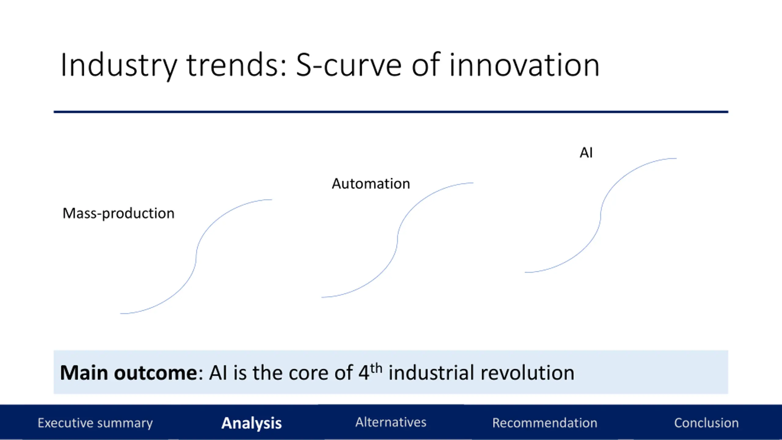 Industry trends: S-curve of innovation AI Automation Mass-production Main outcome: AI is the core of 4th industrial revolution Analysis Alternatives Executive summary Recommendation Conclusion
