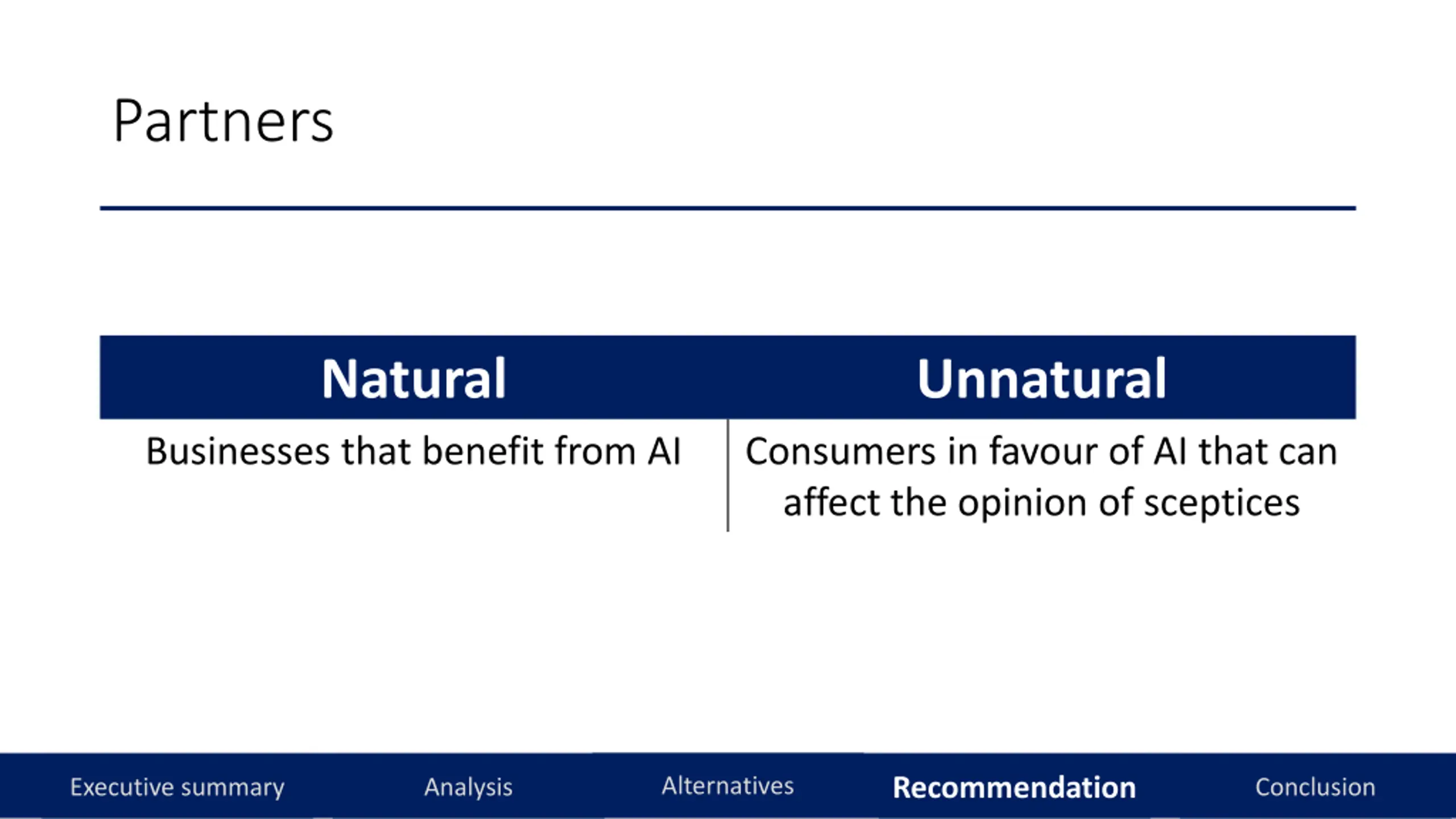 Partners Natural Unnatural Businesses that benefit from AI Consumers in favour of AI that can affect the opinion of sceptices Recommendation Alternatives Executive summary Analysis Conclusion
