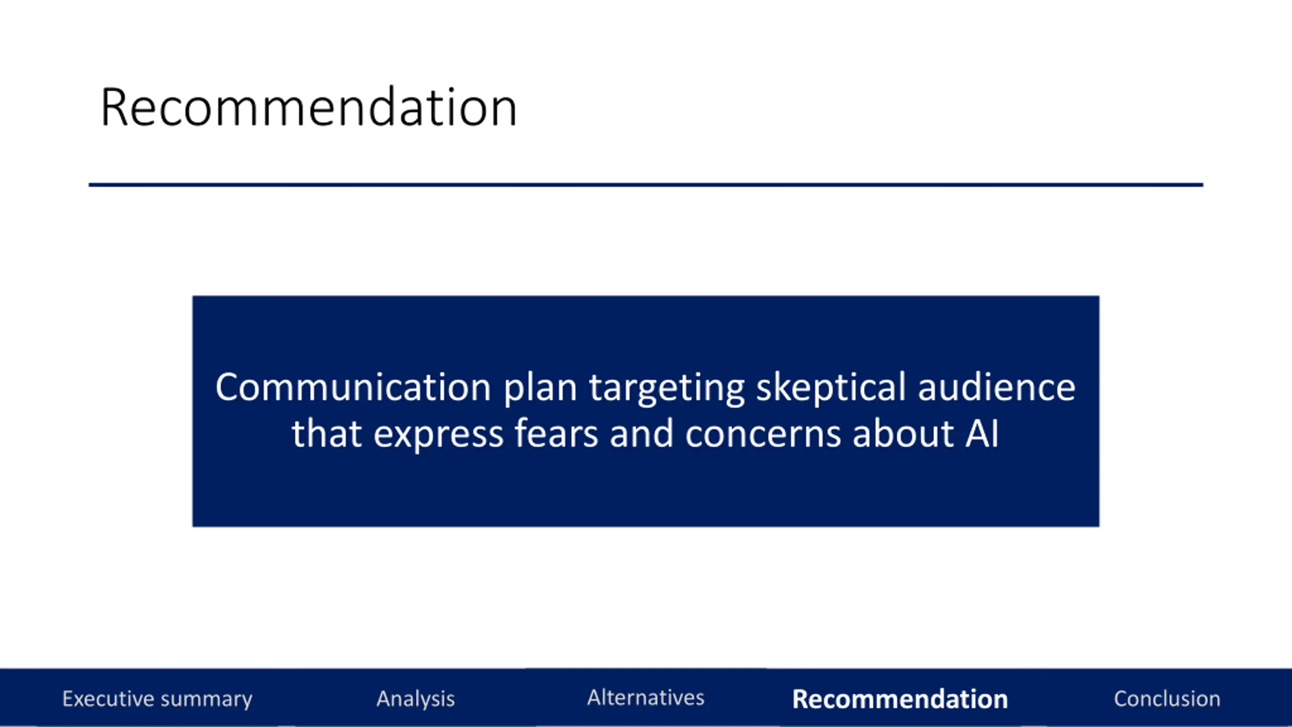 Recommendation Communication plan targeting skeptical audience that express fears and concerns about AI Recommendation Alternatives Executive summary Analysis Conclusion