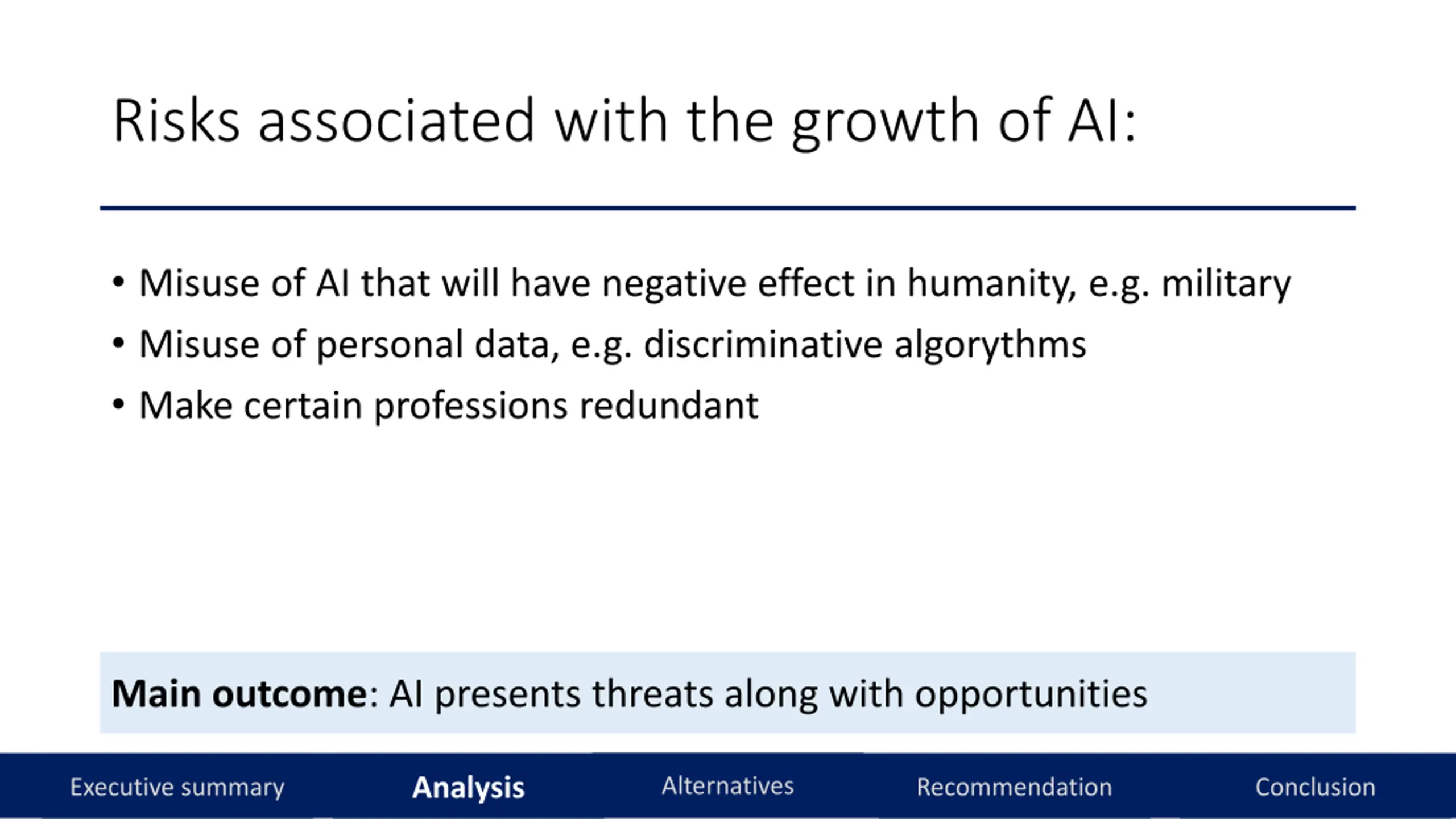 Risks associated with the growth of AI: Misuse of AI that will have negative effect in humanity, e.g. military Misuse of personal data, e.g. discriminative algorythms Make certain professions redundant Main outcome: AI presents threats along with opportunities Analysis Alternatives Executive summary Recommendation Conclusion
