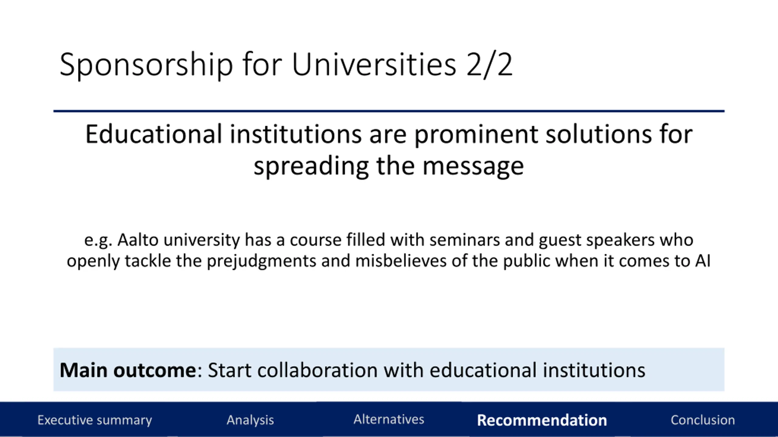 Sponsorship for Universities 2/2 Educational institutions are prominent solutions for spreading the message e.g. Aalto university has a course filled with seminars and guest speakers who openly tackle the prejudgments and misbelieves of the public when it comes to AI Main outcome: Start collaboration with educational institutions Recommendation Alternatives Executive summary Analysis Conclusion