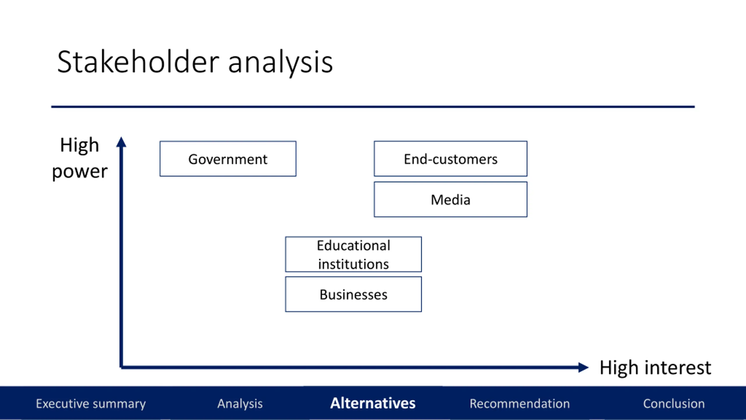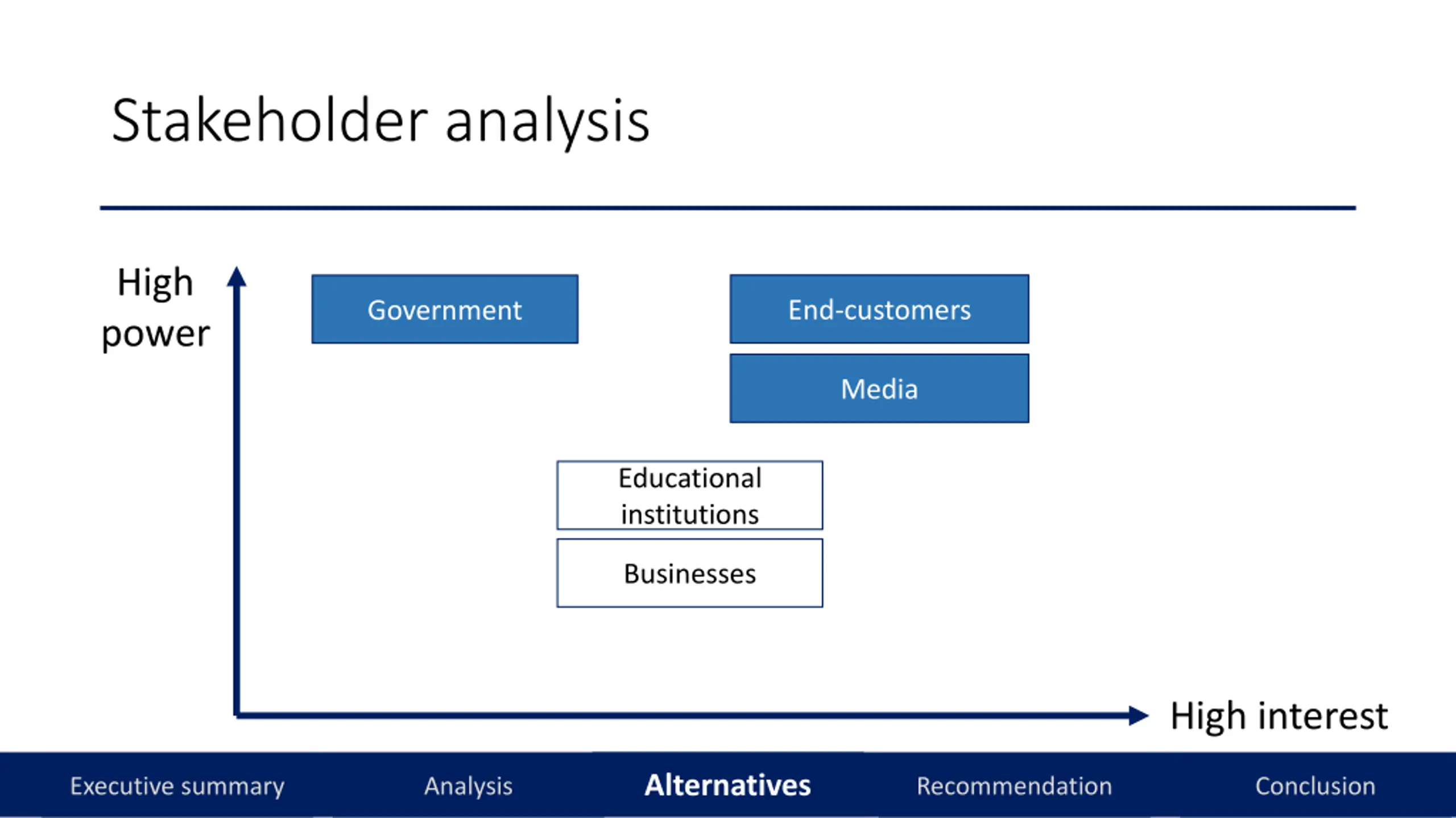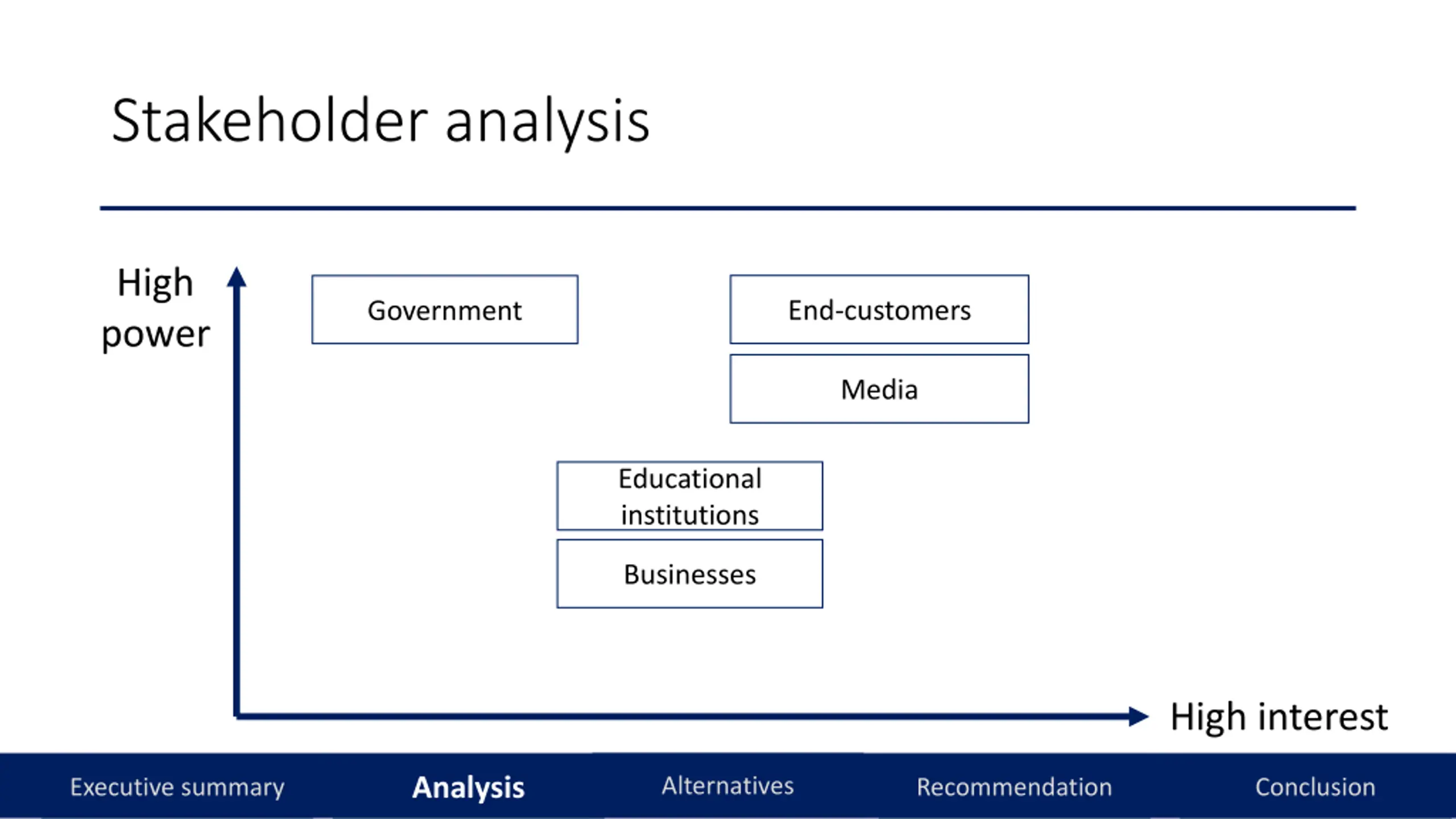 Stakeholder analysis High power End-customers Government Media Educational institutions Businesses High interest Analysis Alternatives Executive summary Recommendation Conclusion