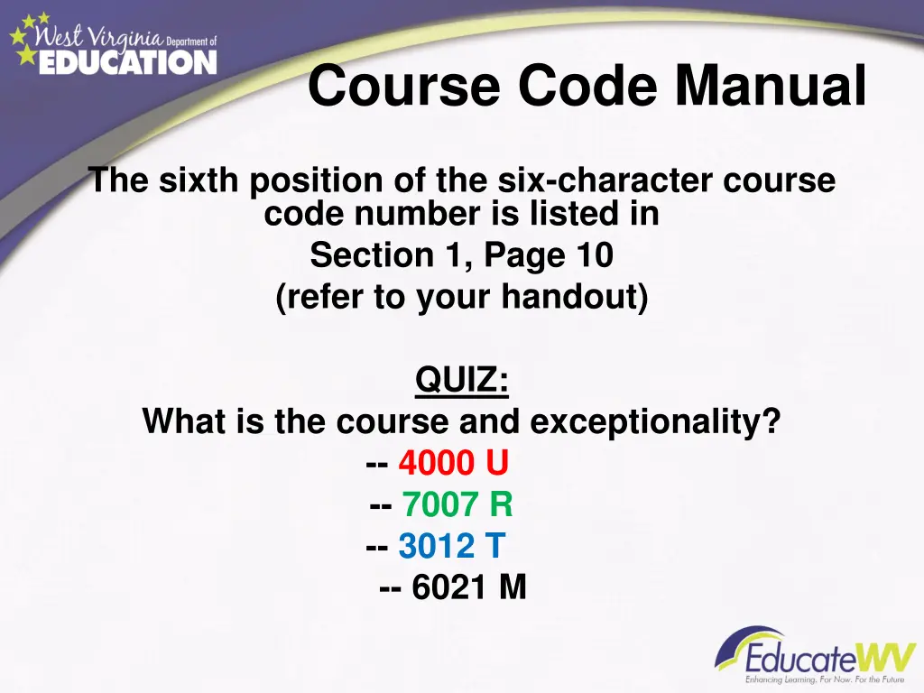 Course Code Manual The sixth position of the six-character course code number is listed in Section 1, Page 10 (refer to your handout) QUIZ: What is the course and exceptionality? -- 4000 U -- 7007 R -- 3012 T -- 6021 M