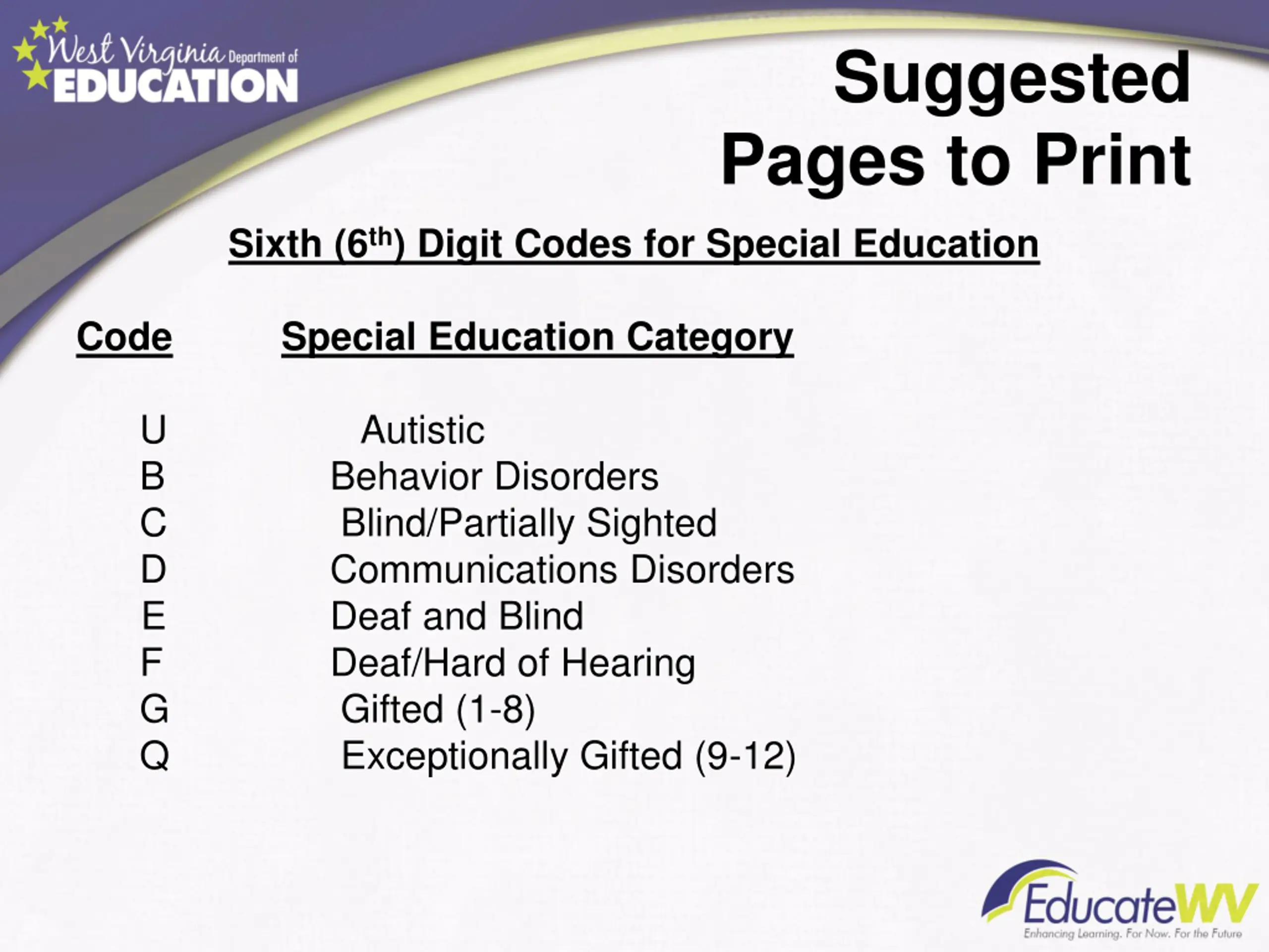 Suggested Pages to Print Sixth (6th) Digit Codes for Special Education Code Special Education Category E Deaf and Blind F Deaf/Hard of Hearing G Gifted (1-8) Q Exceptionally Gifted (9-12) U B C Blind/Partially Sighted D Communications Disorders Autistic Behavior Disorders