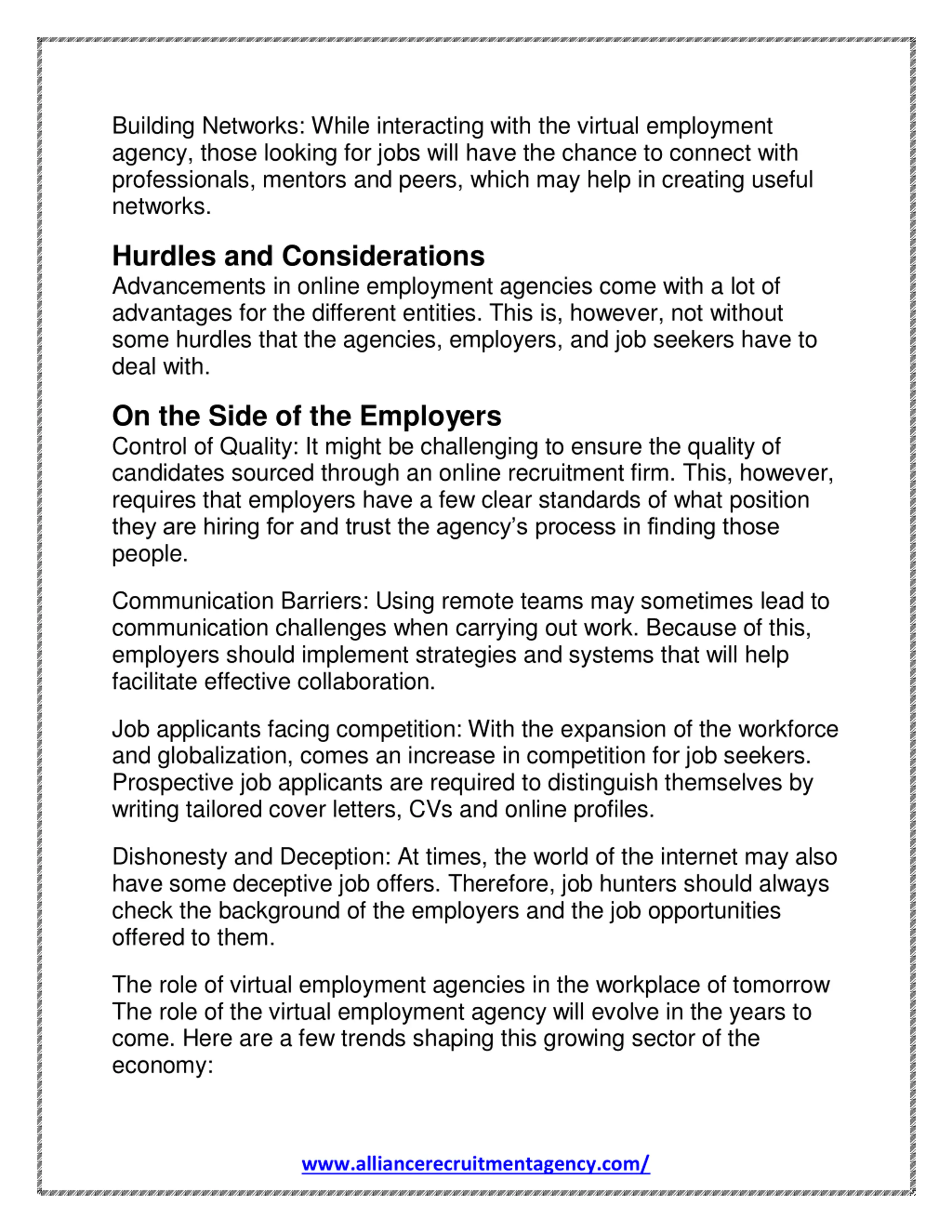 Building Networks: While interacting with the virtual employment agency, those looking for jobs will have the chance to connect with professionals, mentors and peers, which may help in creating useful networks. Hurdles and Considerations Advancements in online employment agencies come with a lot of advantages for the different entities. This is, however, not without some hurdles that the agencies, employers, and job seekers have to deal with. On the Side of the Employers Control of Quality: It might be challenging to ensure the quality of candidates sourced through an online recruitment firm. This, however, requires that employers have a few clear standards of what position they are hiring for and trust the agency s process in finding those people. Communication Barriers: Using remote teams may sometimes lead to communication challenges when carrying out work. Because of this, employers should implement strategies and systems that will help facilitate effective collaboration. Job applicants facing competition: With the expansion of the workforce and globalization, comes an increase in competition for job seekers. Prospective job applicants are required to distinguish themselves by writing tailored cover letters, CVs and online profiles. Dishonesty and Deception: At times, the world of the internet may also have some deceptive job offers. Therefore, job hunters should always check the background of the employers and the job opportunities offered to them. The role of virtual employment agencies in the workplace of tomorrow The role of the virtual employment agency will evolve in the years to come. Here are a few trends shaping this growing sector of the economy: www.alliancerecruitmentagency.com/