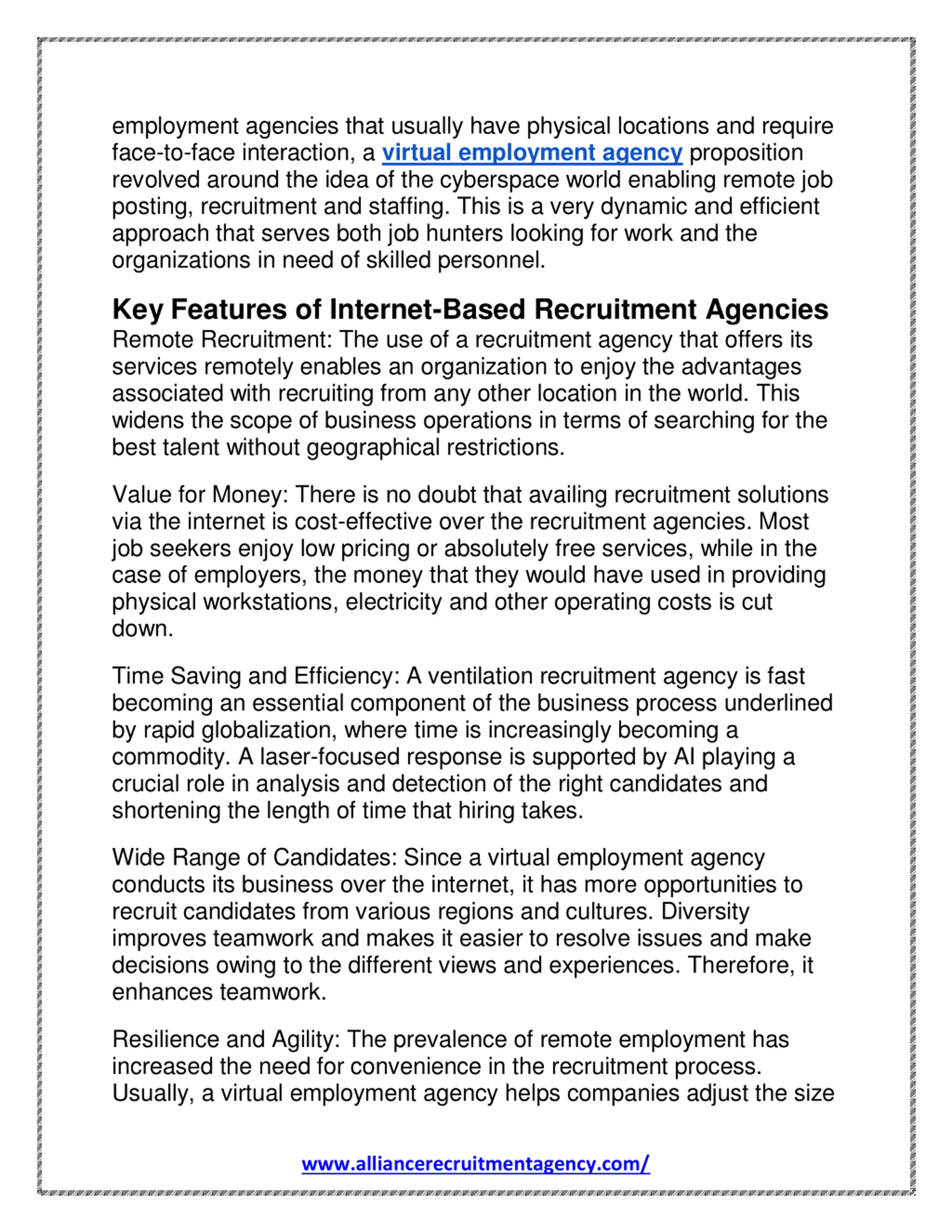 employment agencies that usually have physical locations and require face-to-face interaction, a virtual employment agency proposition revolved around the idea of the cyberspace world enabling remote job posting, recruitment and staffing. This is a very dynamic and efficient approach that serves both job hunters looking for work and the organizations in need of skilled personnel. Key Features of Internet-Based Recruitment Agencies Remote Recruitment: The use of a recruitment agency that offers its services remotely enables an organization to enjoy the advantages associated with recruiting from any other location in the world. This widens the scope of business operations in terms of searching for the best talent without geographical restrictions. Value for Money: There is no doubt that availing recruitment solutions via the internet is cost-effective over the recruitment agencies. Most job seekers enjoy low pricing or absolutely free services, while in the case of employers, the money that they would have used in providing physical workstations, electricity and other operating costs is cut down. Time Saving and Efficiency: A ventilation recruitment agency is fast becoming an essential component of the business process underlined by rapid globalization, where time is increasingly becoming a commodity. A laser-focused response is supported by AI playing a crucial role in analysis and detection of the right candidates and shortening the length of time that hiring takes. Wide Range of Candidates: Since a virtual employment agency conducts its business over the internet, it has more opportunities to recruit candidates from various regions and cultures. Diversity improves teamwork and makes it easier to resolve issues and make decisions owing to the different views and experiences. Therefore, it enhances teamwork. Resilience and Agility: The prevalence of remote employment has increased the need for convenience in the recruitment process. Usually, a virtual employment agency helps companies adjust the size www.alliancerecruitmentagency.com/