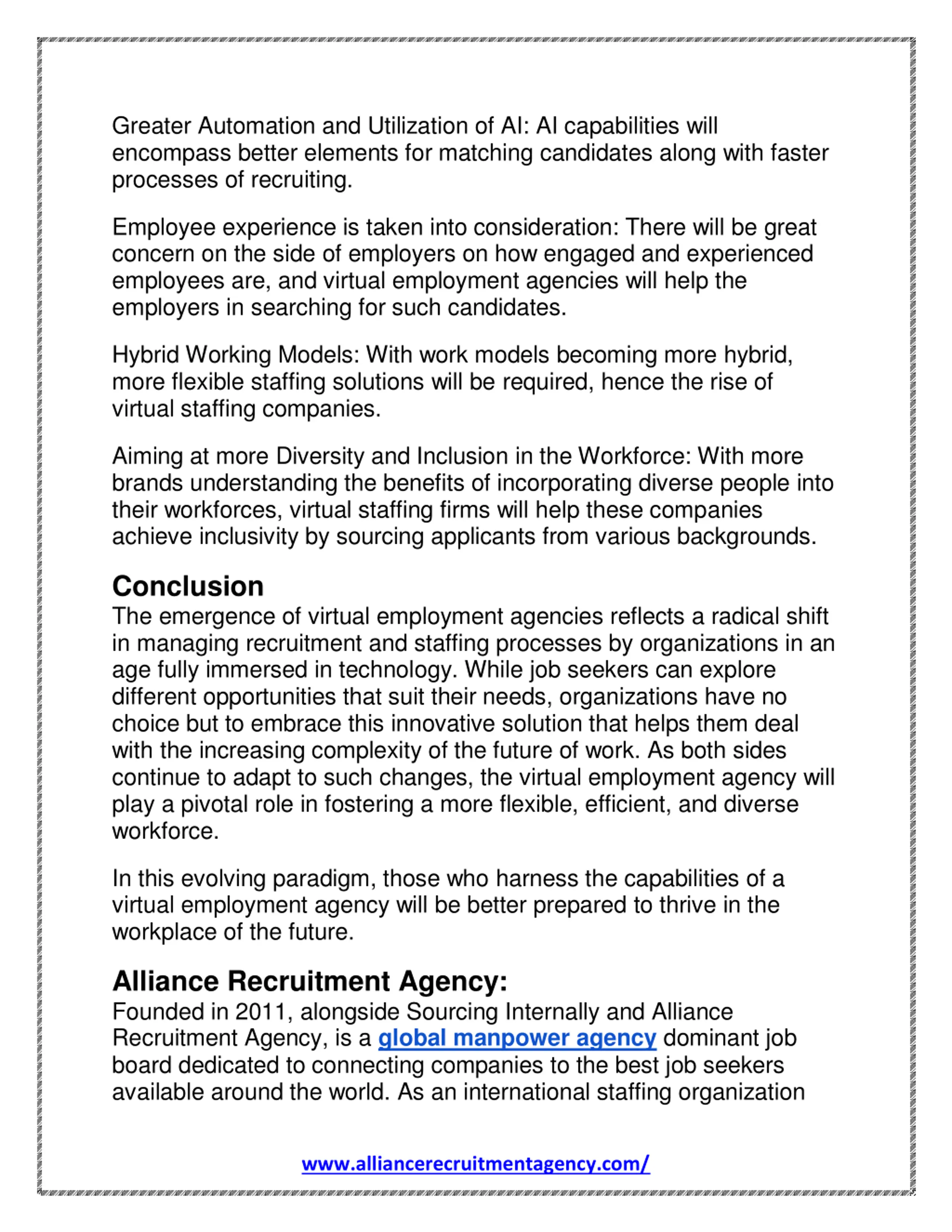 Greater Automation and Utilization of AI: AI capabilities will encompass better elements for matching candidates along with faster processes of recruiting. Employee experience is taken into consideration: There will be great concern on the side of employers on how engaged and experienced employees are, and virtual employment agencies will help the employers in searching for such candidates. Hybrid Working Models: With work models becoming more hybrid, more flexible staffing solutions will be required, hence the rise of virtual staffing companies. Aiming at more Diversity and Inclusion in the Workforce: With more brands understanding the benefits of incorporating diverse people into their workforces, virtual staffing firms will help these companies achieve inclusivity by sourcing applicants from various backgrounds. Conclusion The emergence of virtual employment agencies reflects a radical shift in managing recruitment and staffing processes by organizations in an age fully immersed in technology. While job seekers can explore different opportunities that suit their needs, organizations have no choice but to embrace this innovative solution that helps them deal with the increasing complexity of the future of work. As both sides continue to adapt to such changes, the virtual employment agency will play a pivotal role in fostering a more flexible, efficient, and diverse workforce. In this evolving paradigm, those who harness the capabilities of a virtual employment agency will be better prepared to thrive in the workplace of the future. Alliance Recruitment Agency: Founded in 2011, alongside Sourcing Internally and Alliance Recruitment Agency, is a global manpower agency dominant job board dedicated to connecting companies to the best job seekers available around the world. As an international staffing organization www.alliancerecruitmentagency.com/