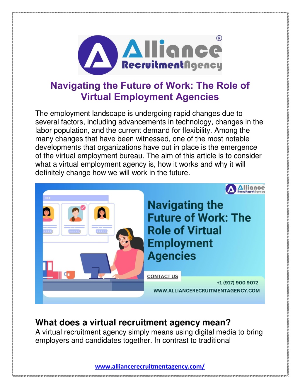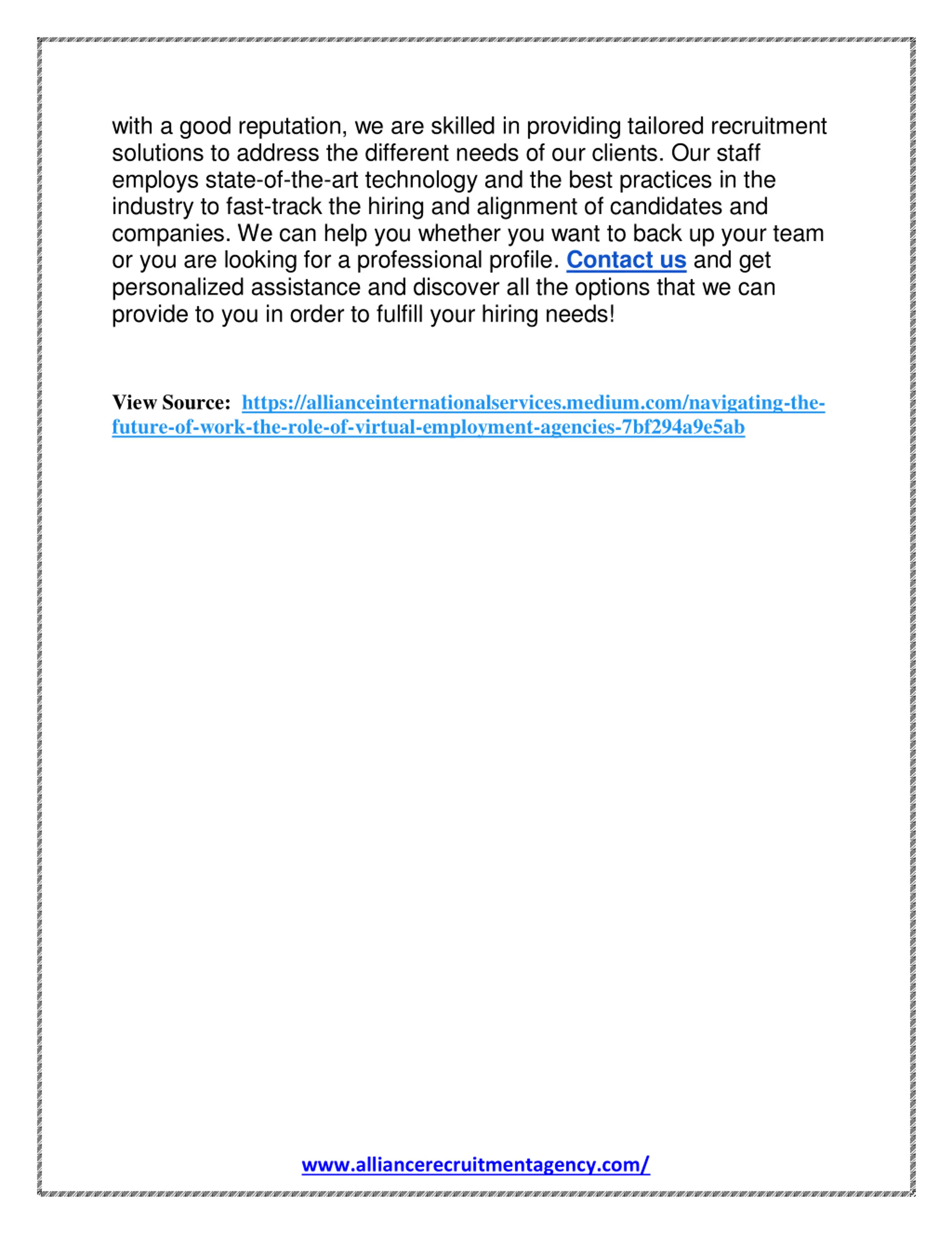 with a good reputation, we are skilled in providing tailored recruitment solutions to address the different needs of our clients. Our staff employs state-of-the-art technology and the best practices in the industry to fast-track the hiring and alignment of candidates and companies. We can help you whether you want to back up your team or you are looking for a professional profile. Contact us and get personalized assistance and discover all the options that we can provide to you in order to fulfill your hiring needs! View Source: https://allianceinternationalservices.medium.com/navigating-the- future-of-work-the-role-of-virtual-employment-agencies-7bf294a9e5ab www.alliancerecruitmentagency.com/