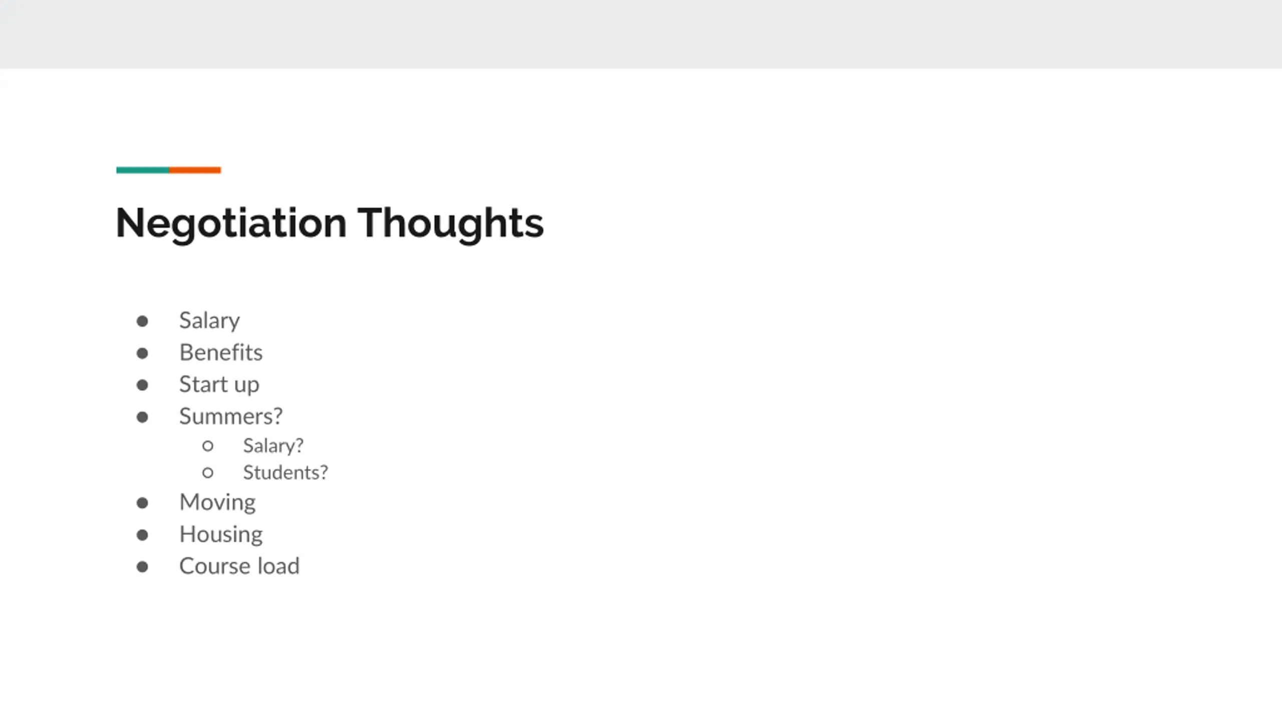 Negotiation Thoughts Salary Benefits Start up Summers? Moving Housing Course load Salary? Students?