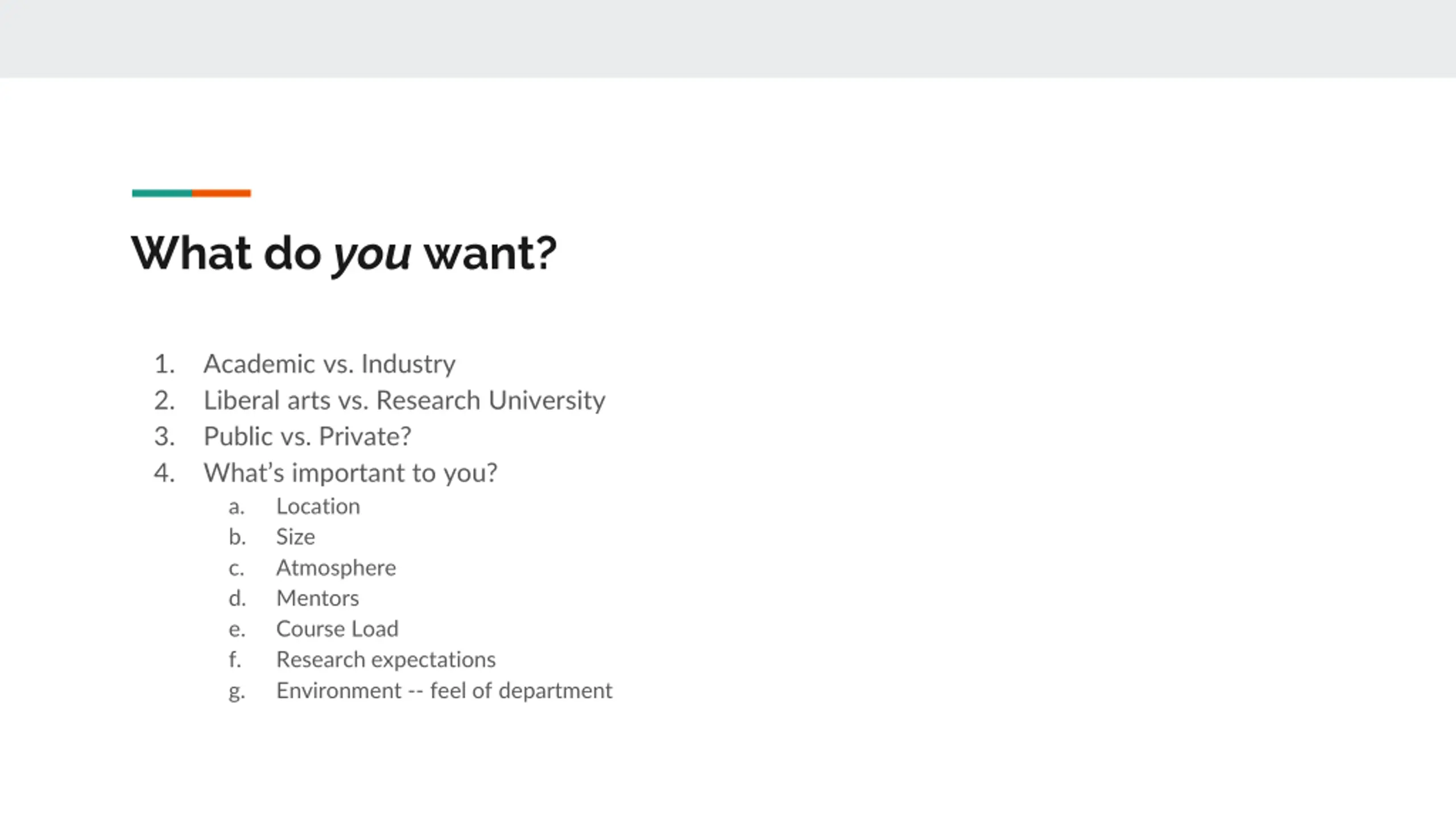 What do you want? 1. 2. 3. 4. Academic vs. Industry Liberal arts vs. Research University Public vs. Private? What s important to you? a. Location b. Size c. Atmosphere d. Mentors e. Course Load f. Research expectations g. Environment -- feel of department