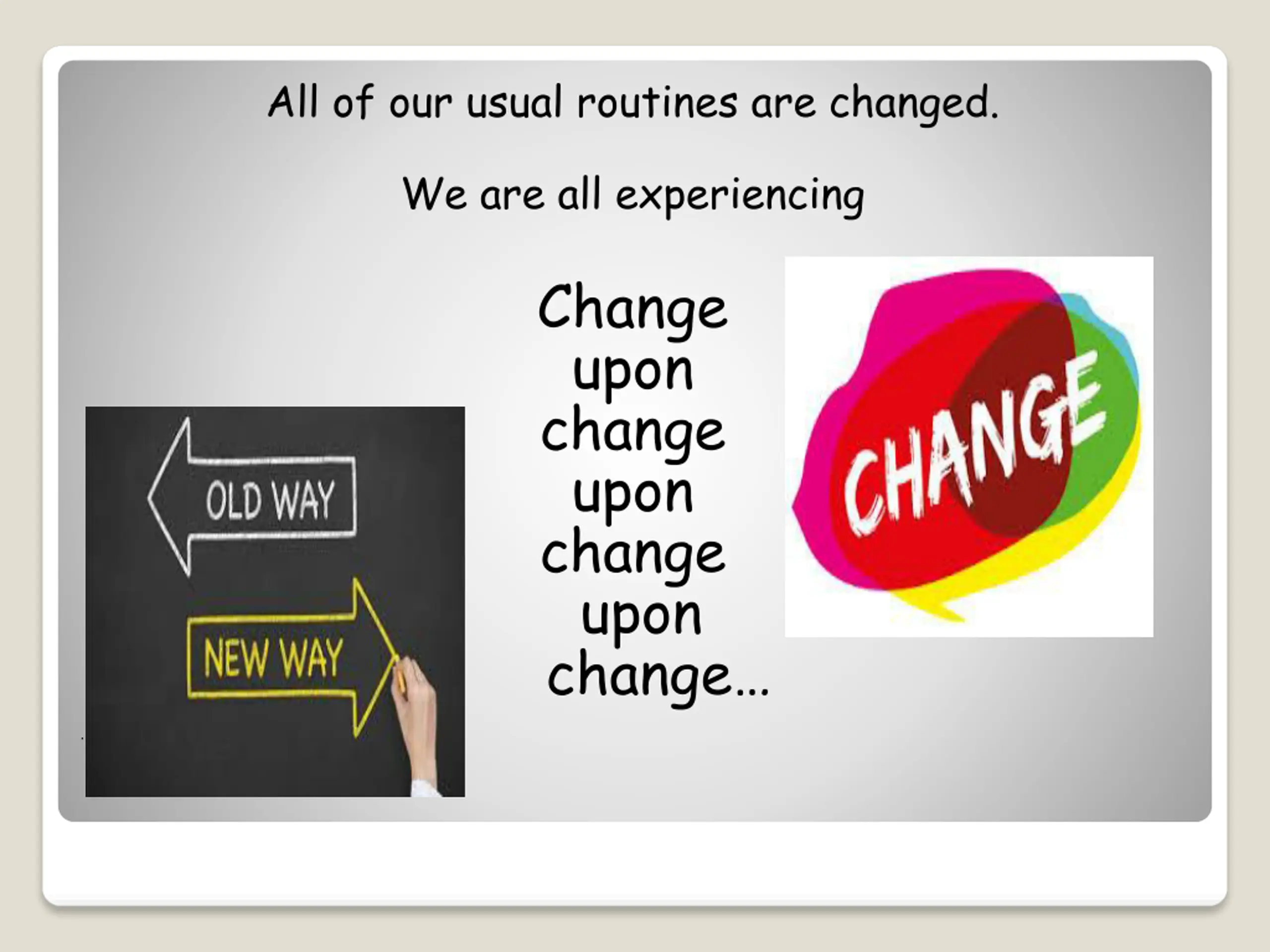 All of our usual routines are changed. We are all experiencing Change upon change upon change upon change .