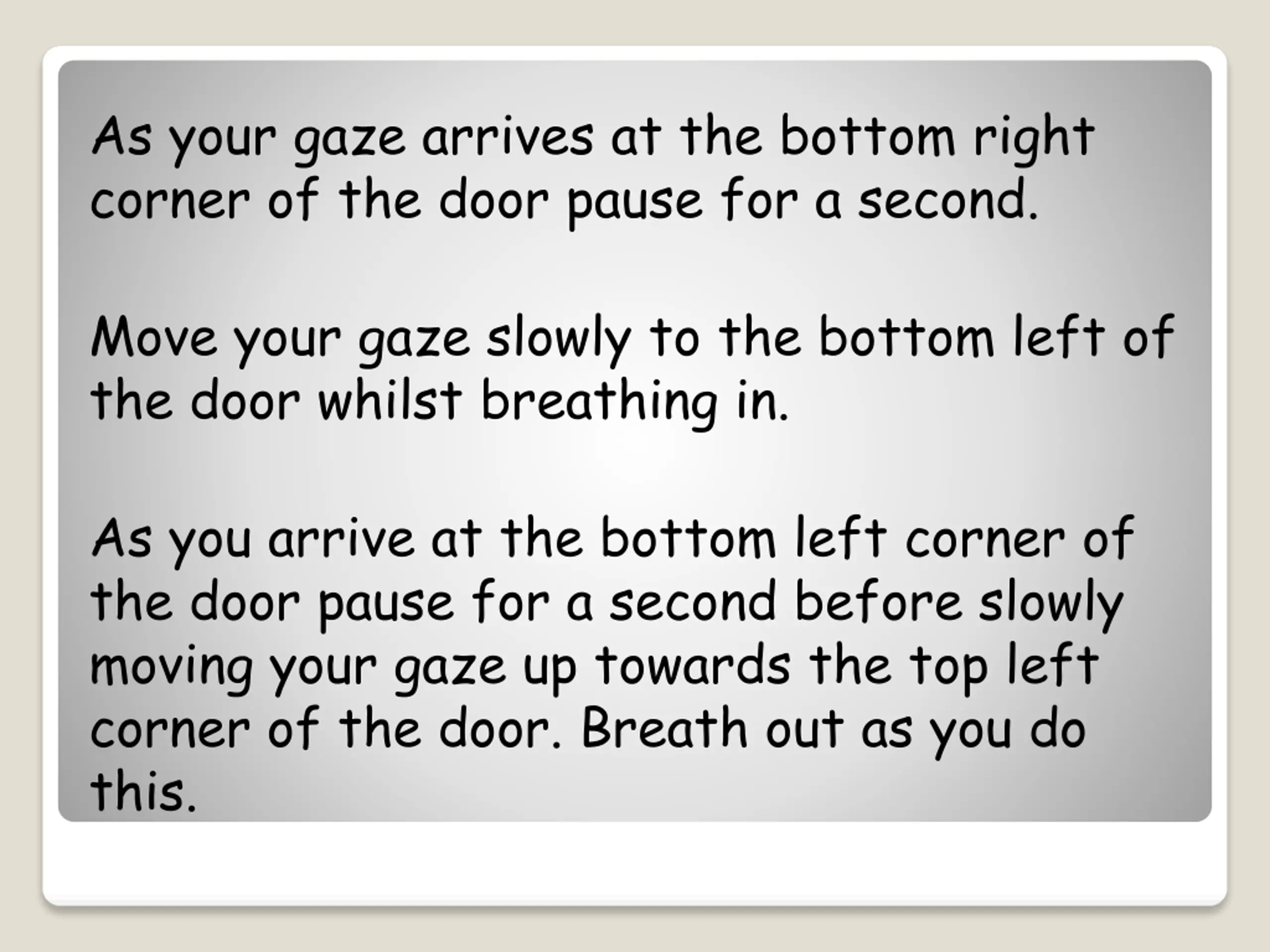 As your gaze arrives at the bottom right corner of the door pause for a second. Move your gaze slowly to the bottom left of the door whilst breathing in. As you arrive at the bottom left corner of the door pause for a second before slowly moving your gaze up towards the top left corner of the door. Breath out as you do this.
