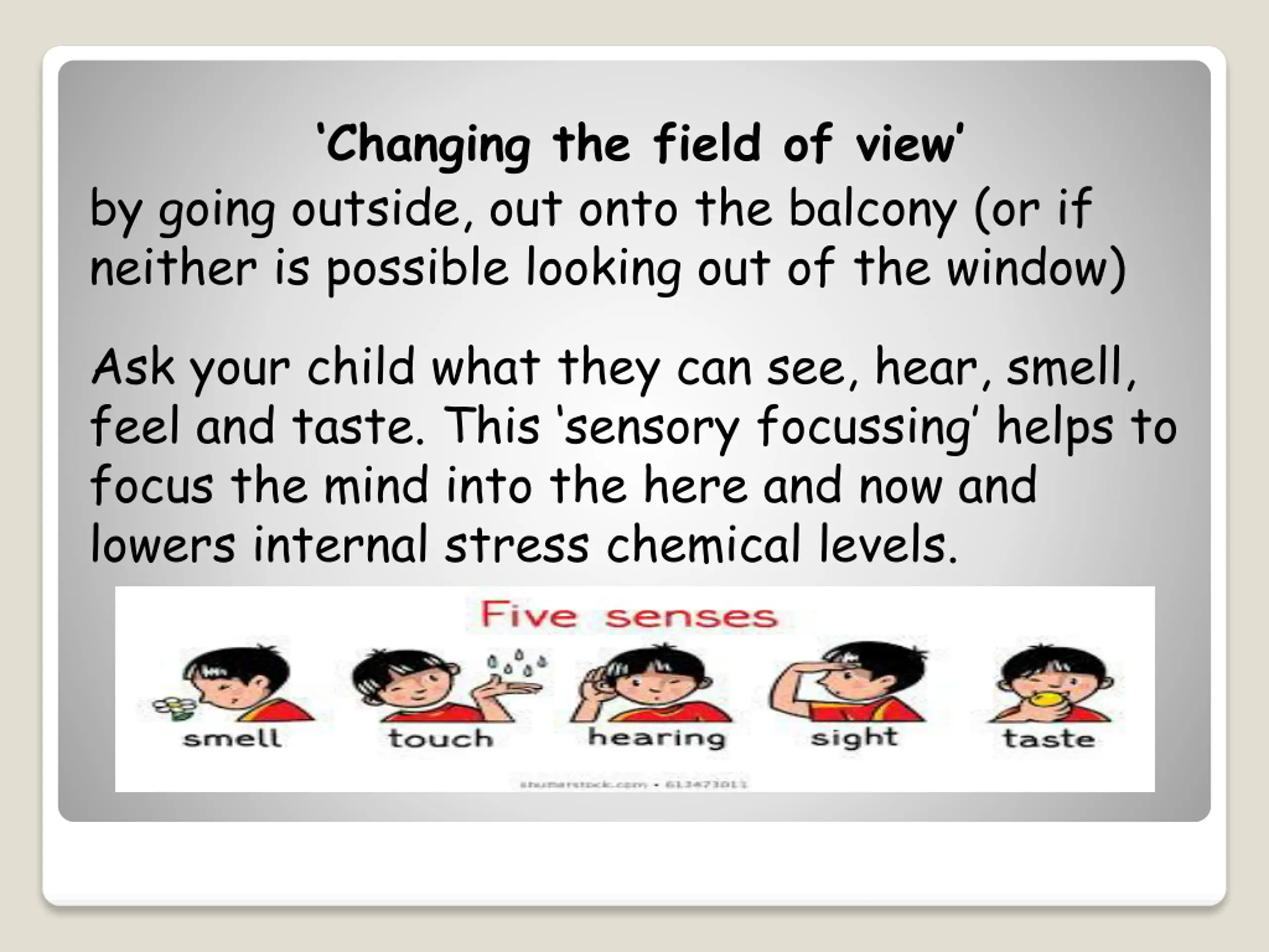 Changing the field of view by going outside, out onto the balcony (or if neither is possible looking out of the window) Ask your child what they can see, hear, smell, feel and taste. This sensory focussing helps to focus the mind into the here and now and lowers internal stress chemical levels.