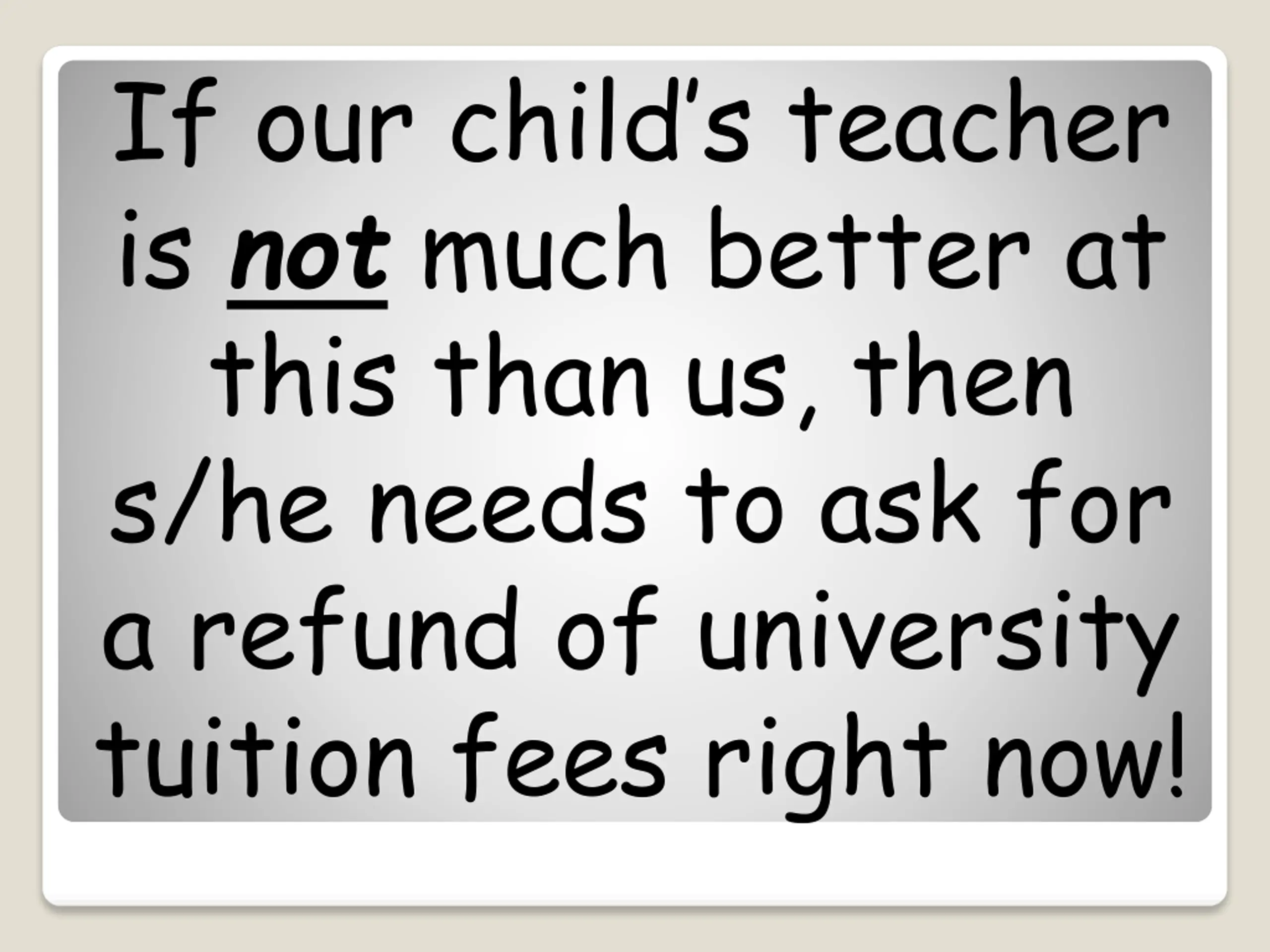 If our childs teacher is not much better at this than us, then s/he needs to ask for a refund of university tuition fees right now!