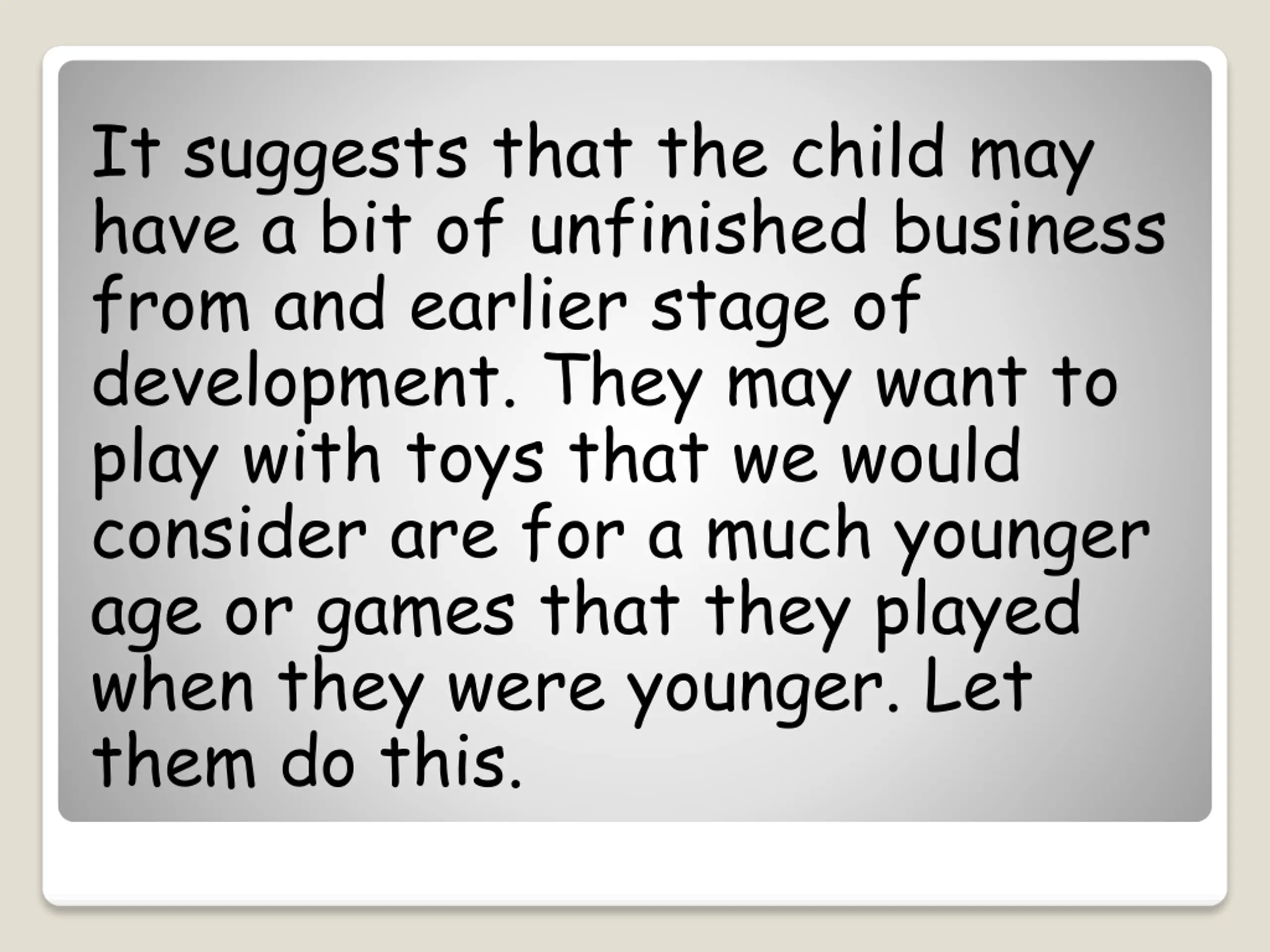 It suggests that the child may have a bit of unfinished business from and earlier stage of development. They may want to play with toys that we would consider are for a much younger age or games that they played when they were younger. Let them do this.
