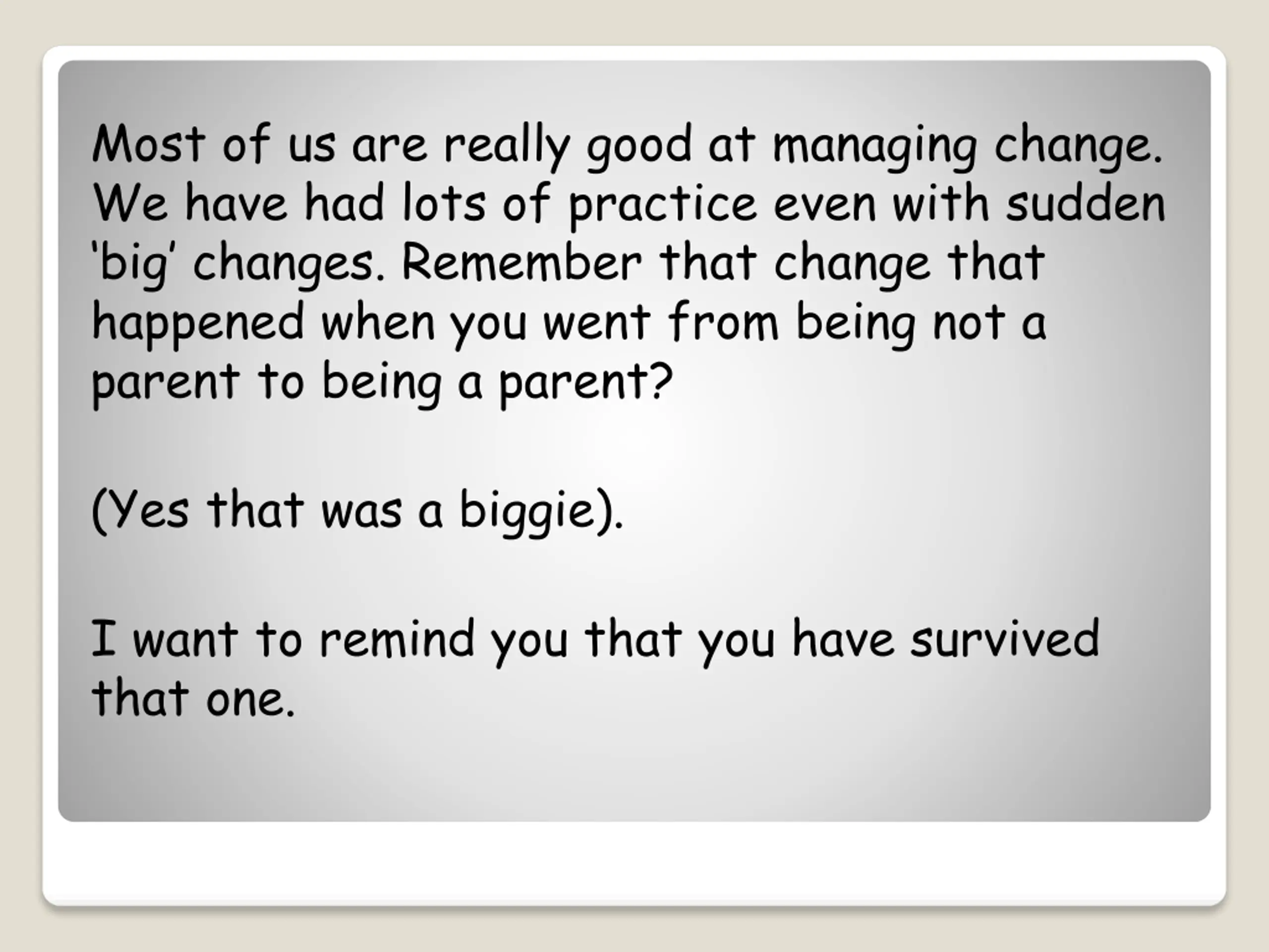 Most of us are really good at managing change. We have had lots of practice even with sudden big changes. Remember that change that happened when you went from being not a parent to being a parent? (Yes that was a biggie). I want to remind you that you have survived that one.