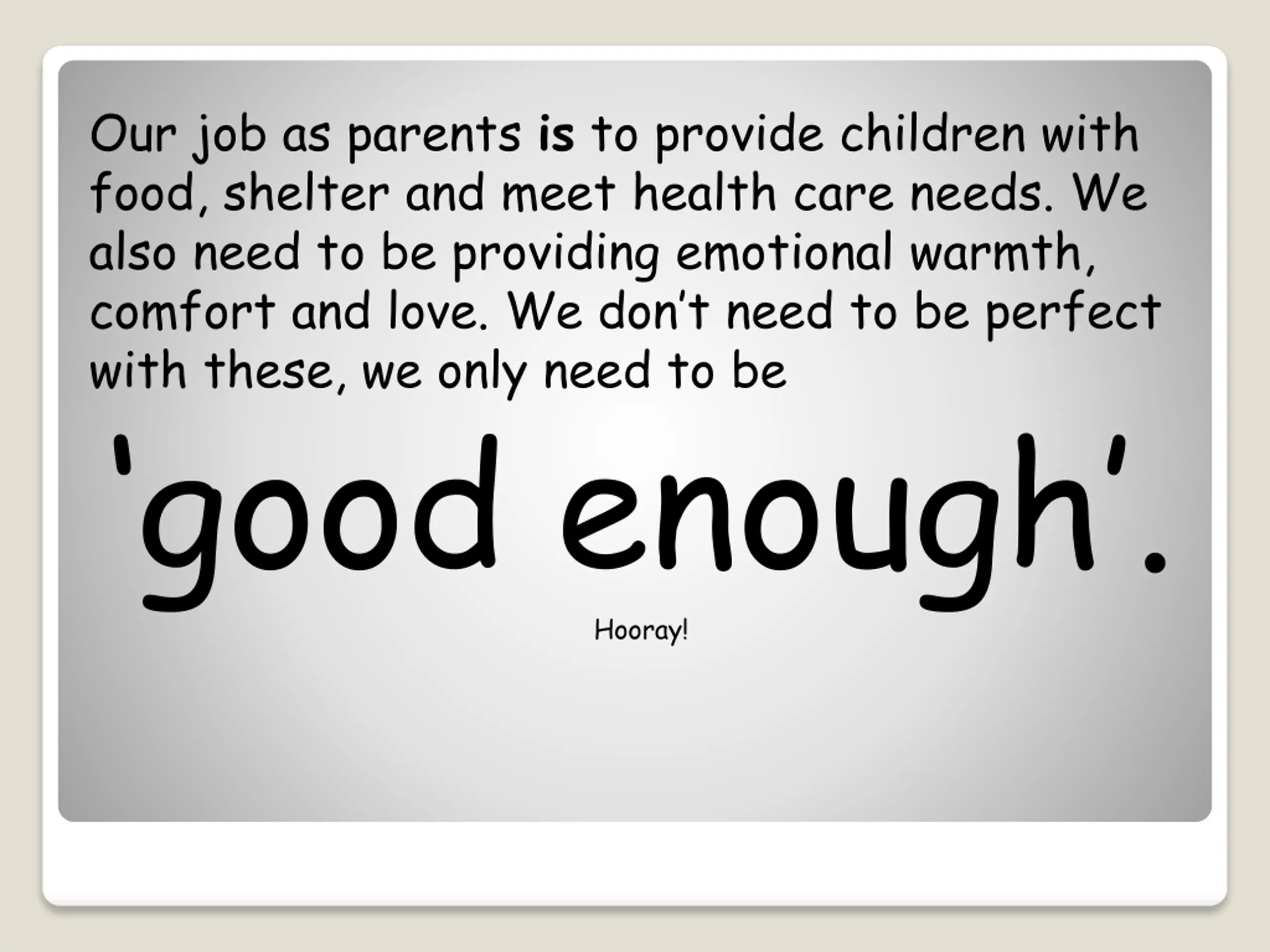 Our job as parents is to provide children with food, shelter and meet health care needs. We also need to be providing emotional warmth, comfort and love. We don t need to be perfect with these, we only need to be good enough . Hooray!