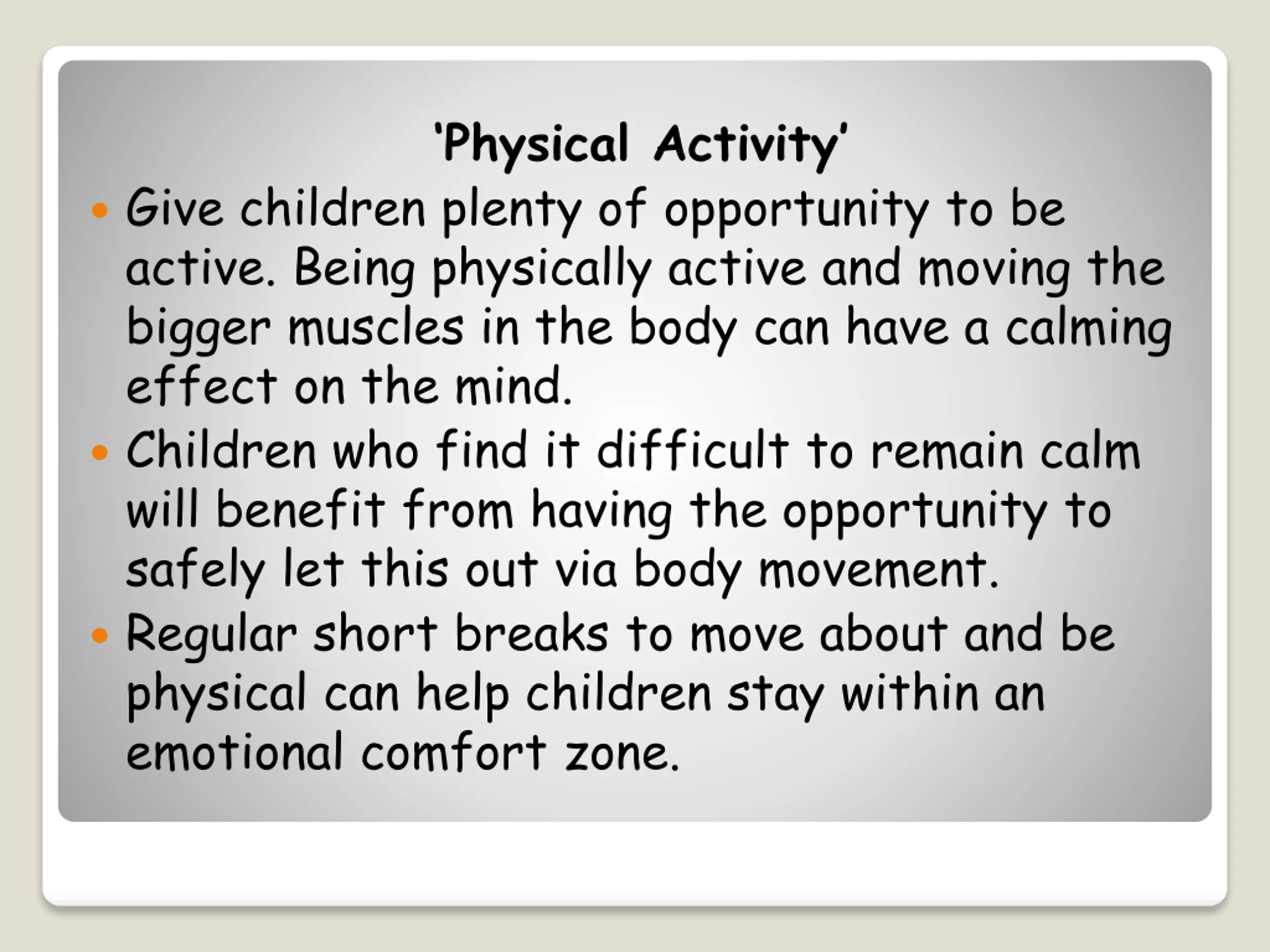 Physical Activity Give children plenty of opportunity to be active. Being physically active and moving the bigger muscles in the body can have a calming effect on the mind. Children who find it difficult to remain calm will benefit from having the opportunity to safely let this out via body movement. Regular short breaks to move about and be physical can help children stay within an emotional comfort zone.