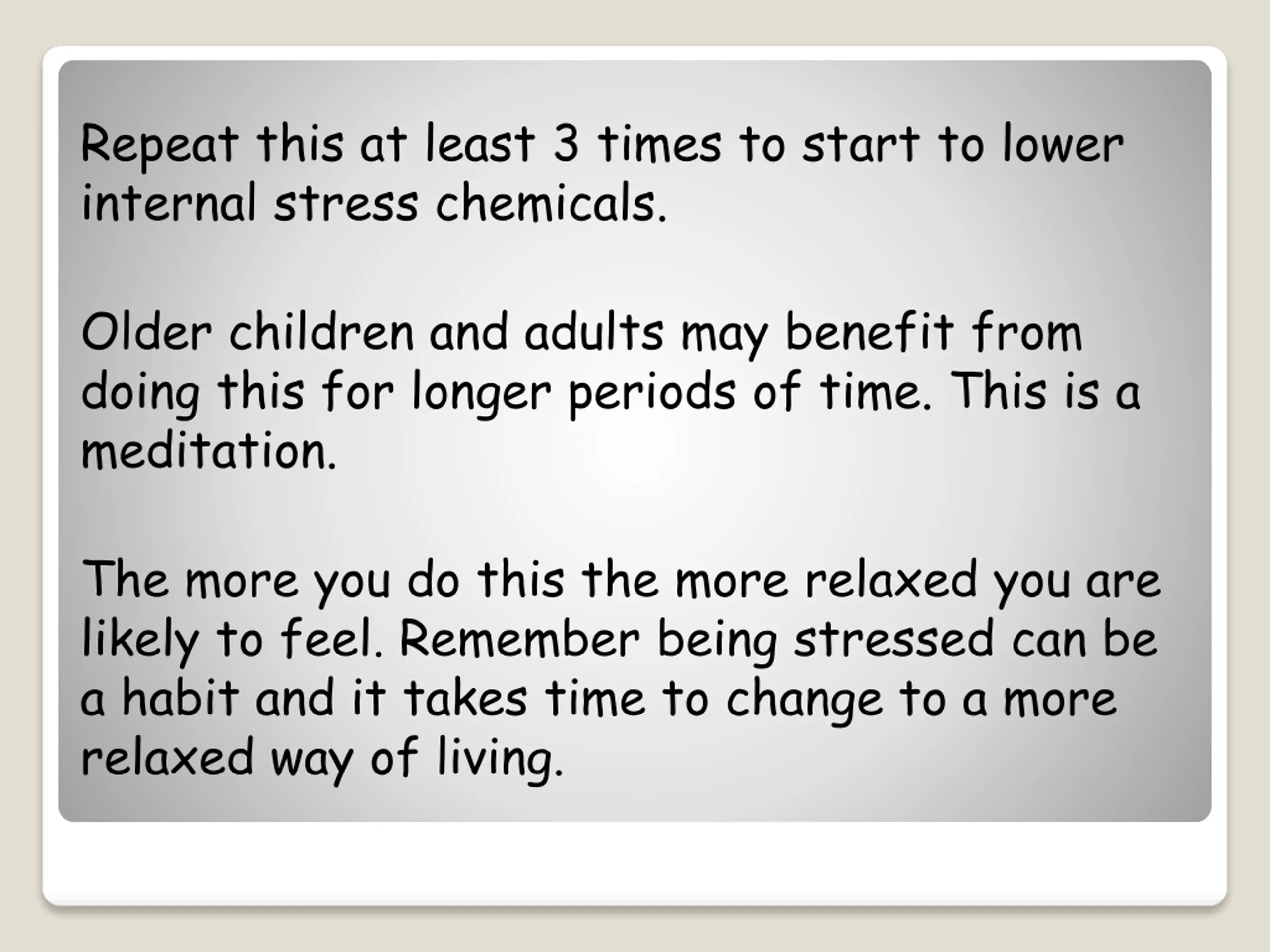 Repeat this at least 3 times to start to lower internal stress chemicals. Older children and adults may benefit from doing this for longer periods of time. This is a meditation. The more you do this the more relaxed you are likely to feel. Remember being stressed can be a habit and it takes time to change to a more relaxed way of living.