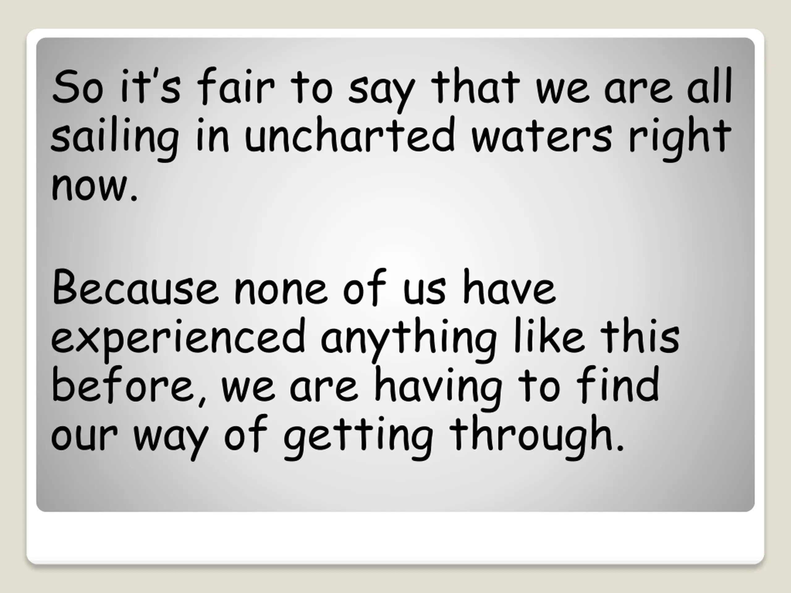 So its fair to say that we are all sailing in uncharted waters right now. Because none of us have experienced anything like this before, we are having to find our way of getting through.