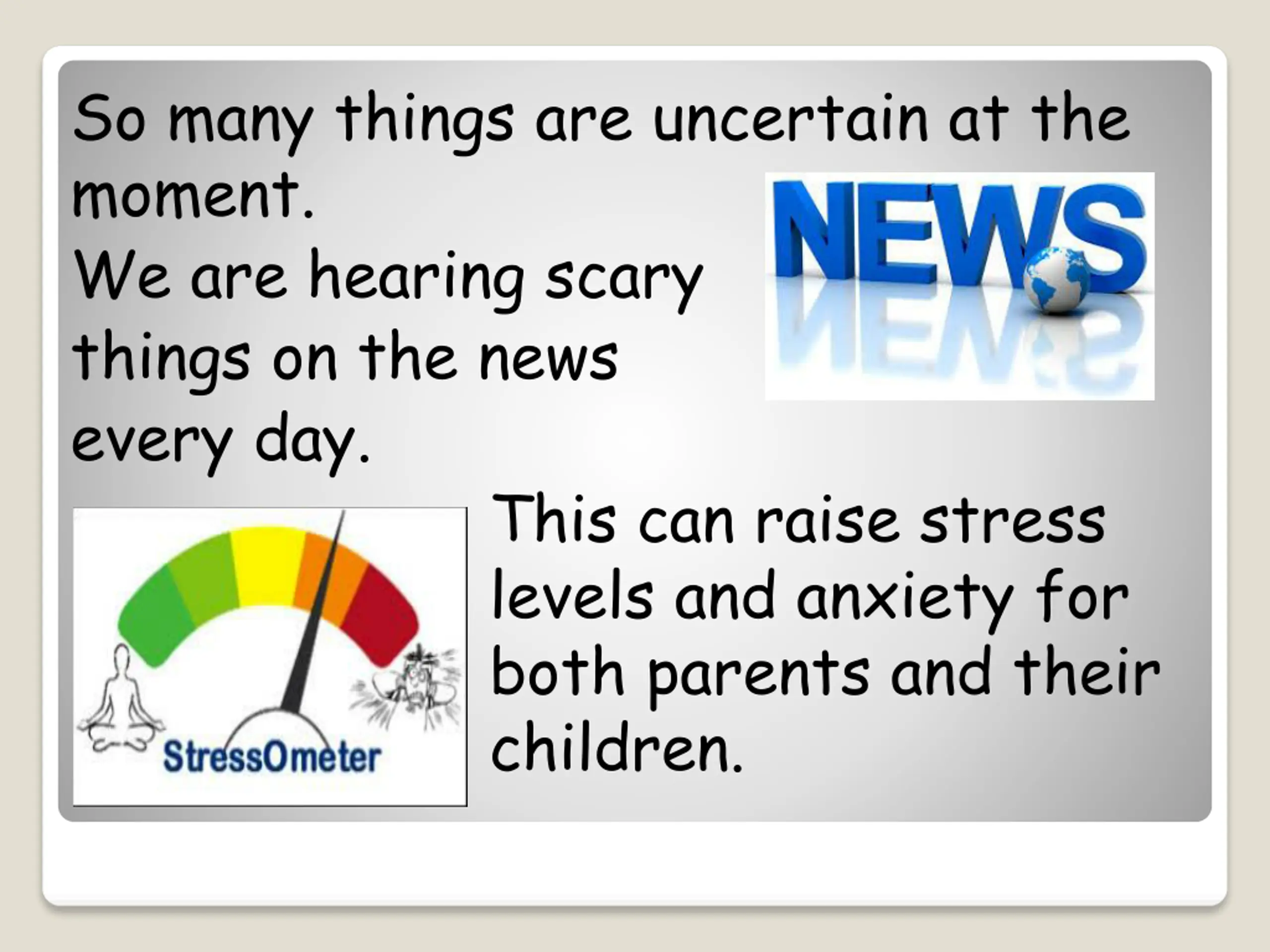 So many things are uncertain at the moment. We are hearing scary things on the news every day. This can raise stress levels and anxiety for both parents and their children.
