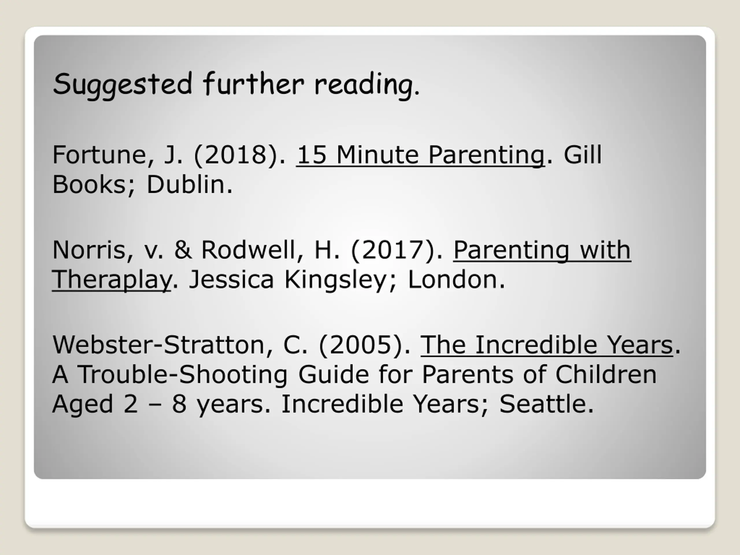 Suggested further reading. Fortune, J. (2018). 15 Minute Parenting. Gill Books; Dublin. Norris, v. & Rodwell, H. (2017). Parenting with Theraplay. Jessica Kingsley; London. Webster-Stratton, C. (2005). The Incredible Years. A Trouble-Shooting Guide for Parents of Children Aged 2 8 years. Incredible Years; Seattle.
