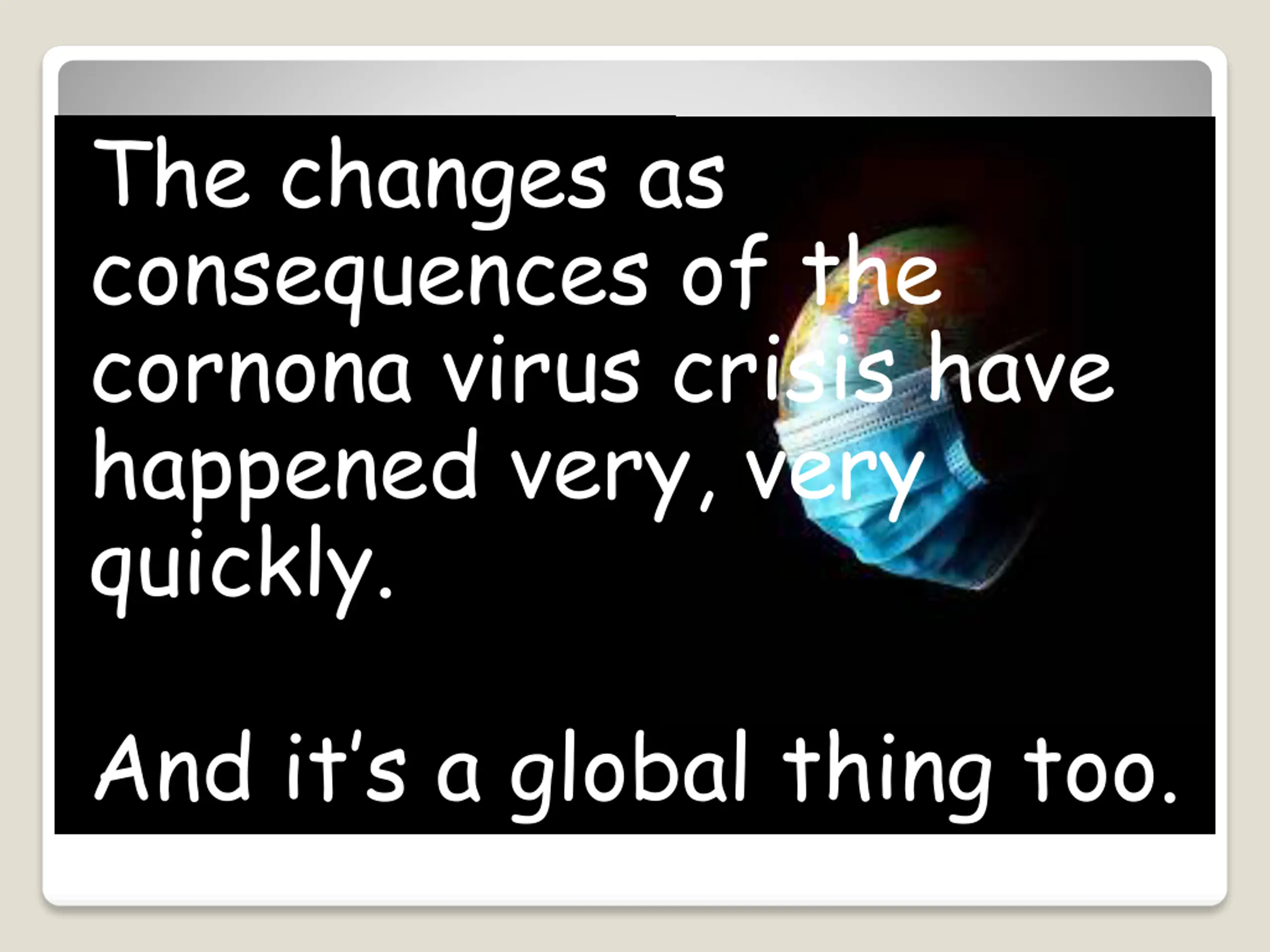 The changes as consequences of the cornona virus crisis have happened very, very quickly. And it s a global thing too.