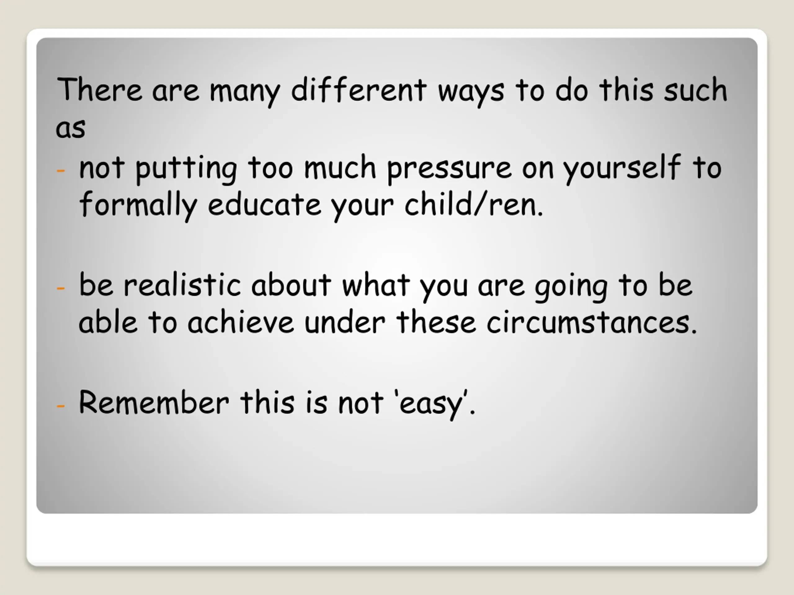 There are many different ways to do this such as - not putting too much pressure on yourself to formally educate your child/ren. - be realistic about what you are going to be able to achieve under these circumstances. - Remember this is not easy .