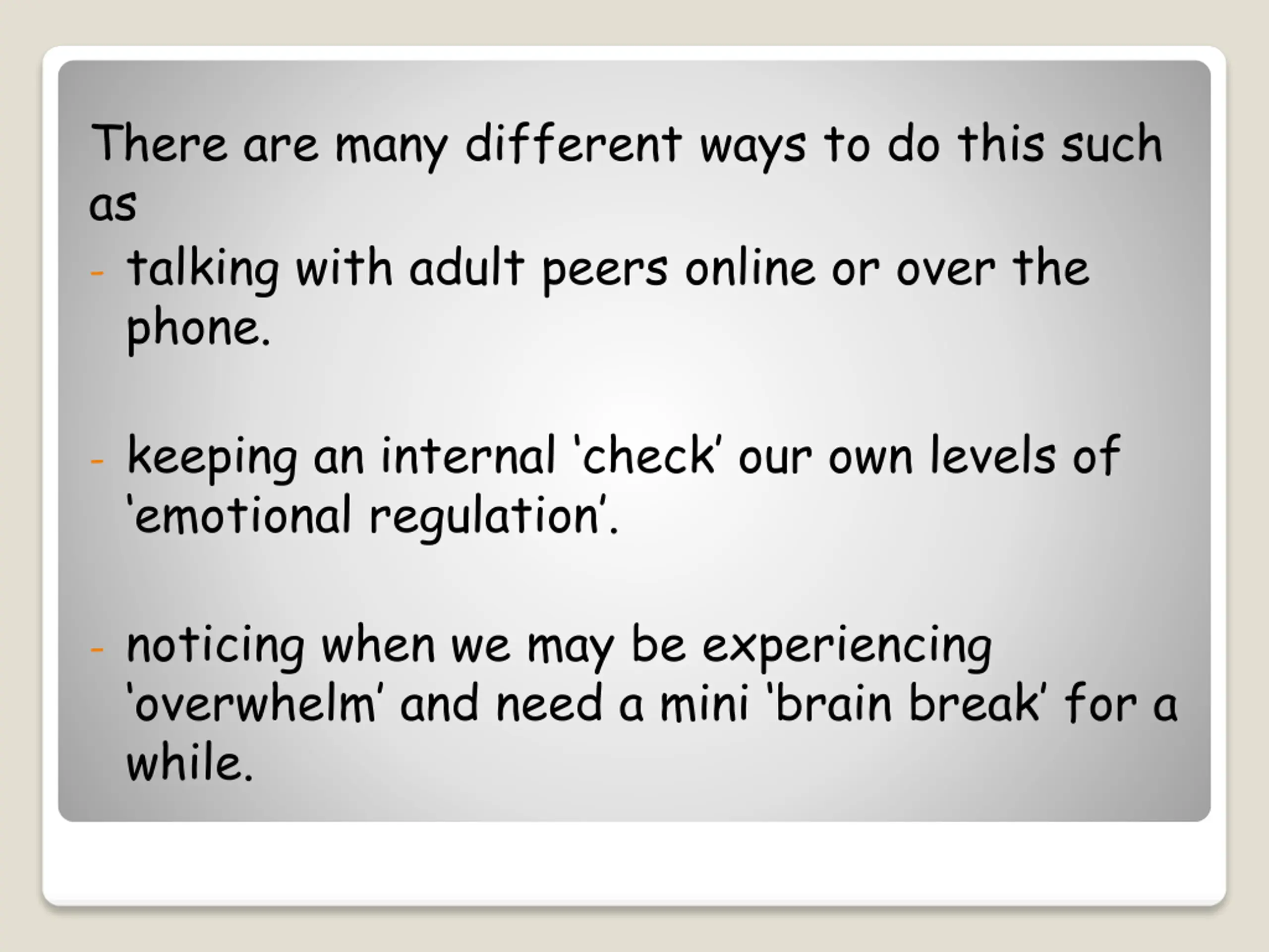 There are many different ways to do this such as - talking with adult peers online or over the phone. - keeping an internal check our own levels of emotional regulation . - noticing when we may be experiencing overwhelm and need a mini brain break for a while.