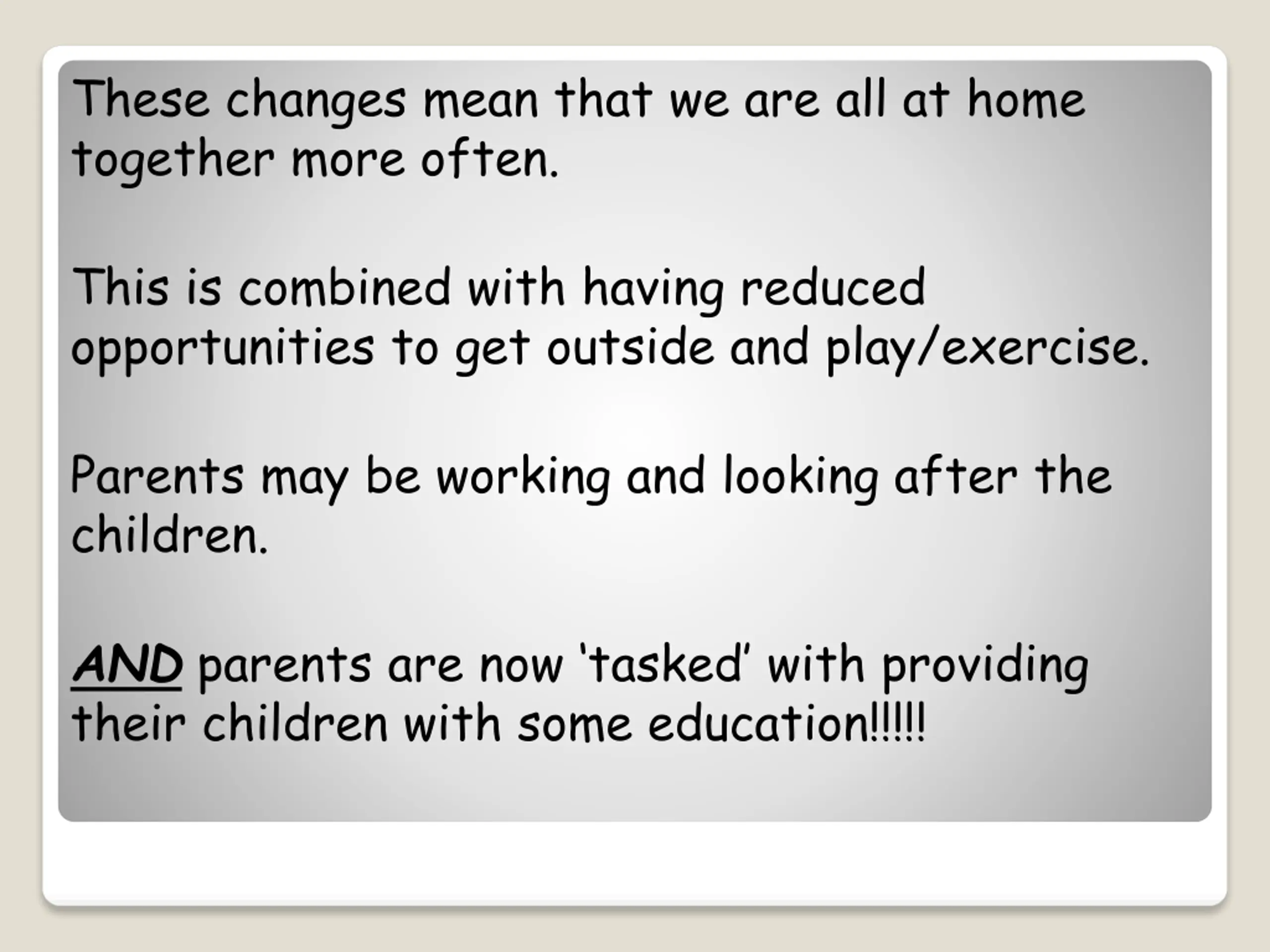 These changes mean that we are all at home together more often. This is combined with having reduced opportunities to get outside and play/exercise. Parents may be working and looking after the children. ANDparents are now tasked with providing their children with some education!!!!!