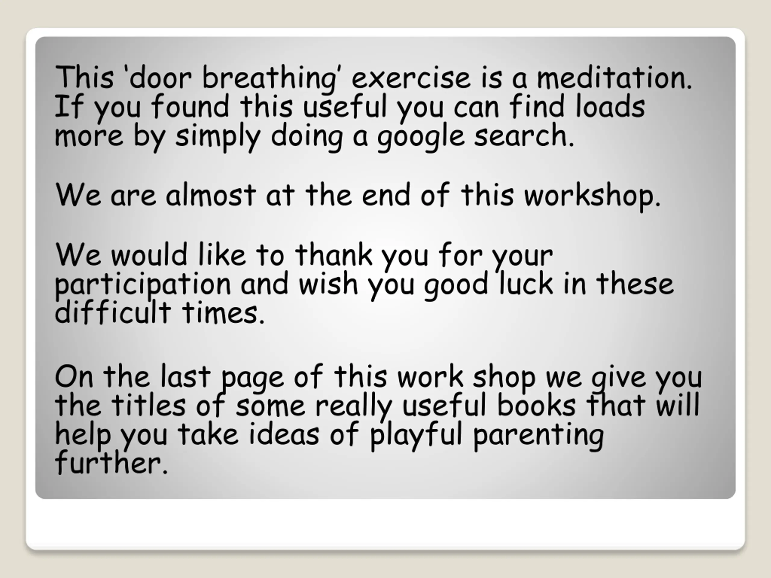 This door breathing exercise is a meditation. If you found this useful you can find loads more by simply doing a google search. We are almost at the end of this workshop. We would like to thank you for your participation and wish you good luck in these difficult times. On the last page of this work shop we give you the titles of some really useful books that will help you take ideas of playful parenting further.