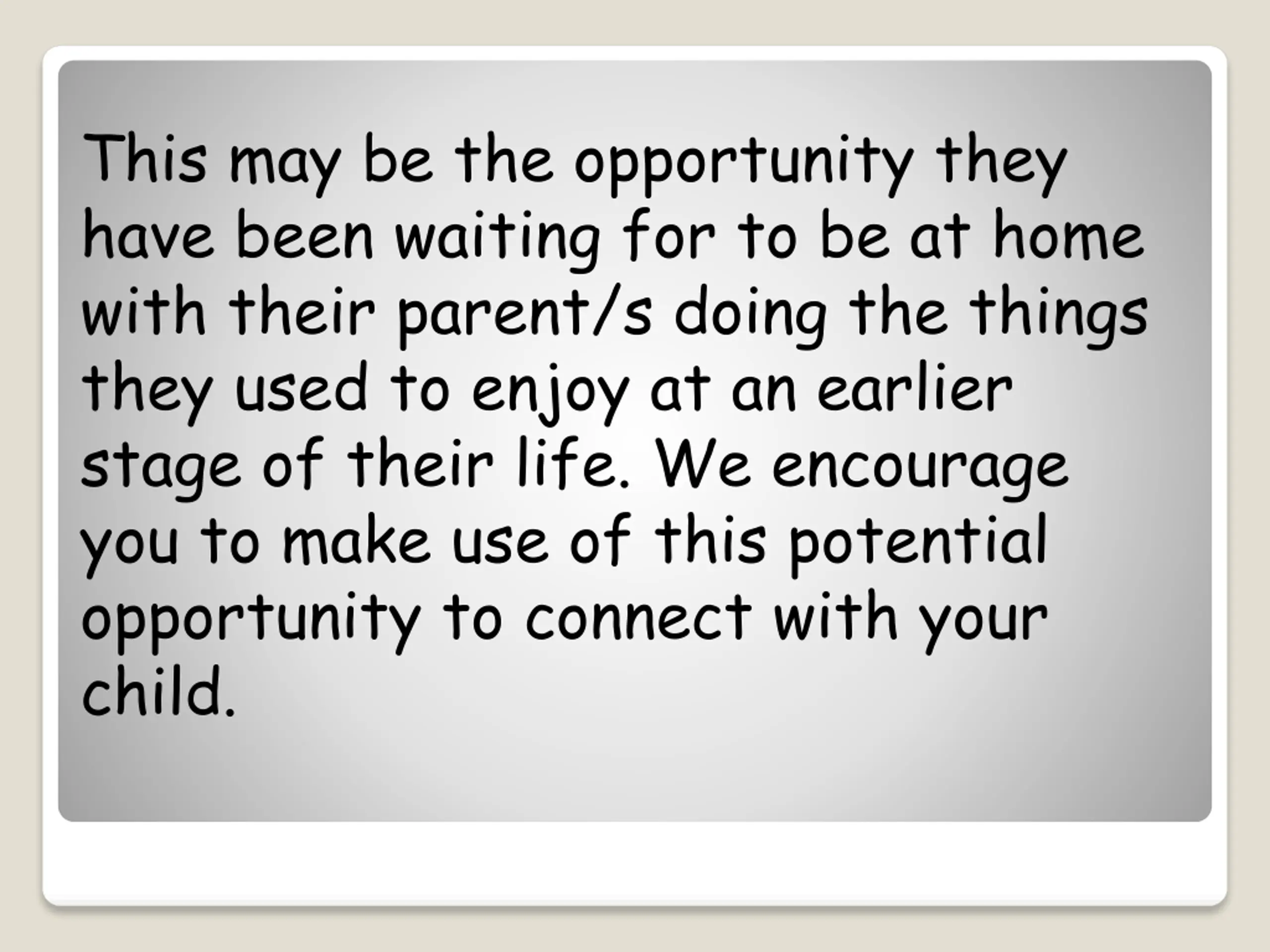 This may be the opportunity they have been waiting for to be at home with their parent/s doing the things they used to enjoy at an earlier stage of their life. We encourage you to make use of this potential opportunity to connect with your child.