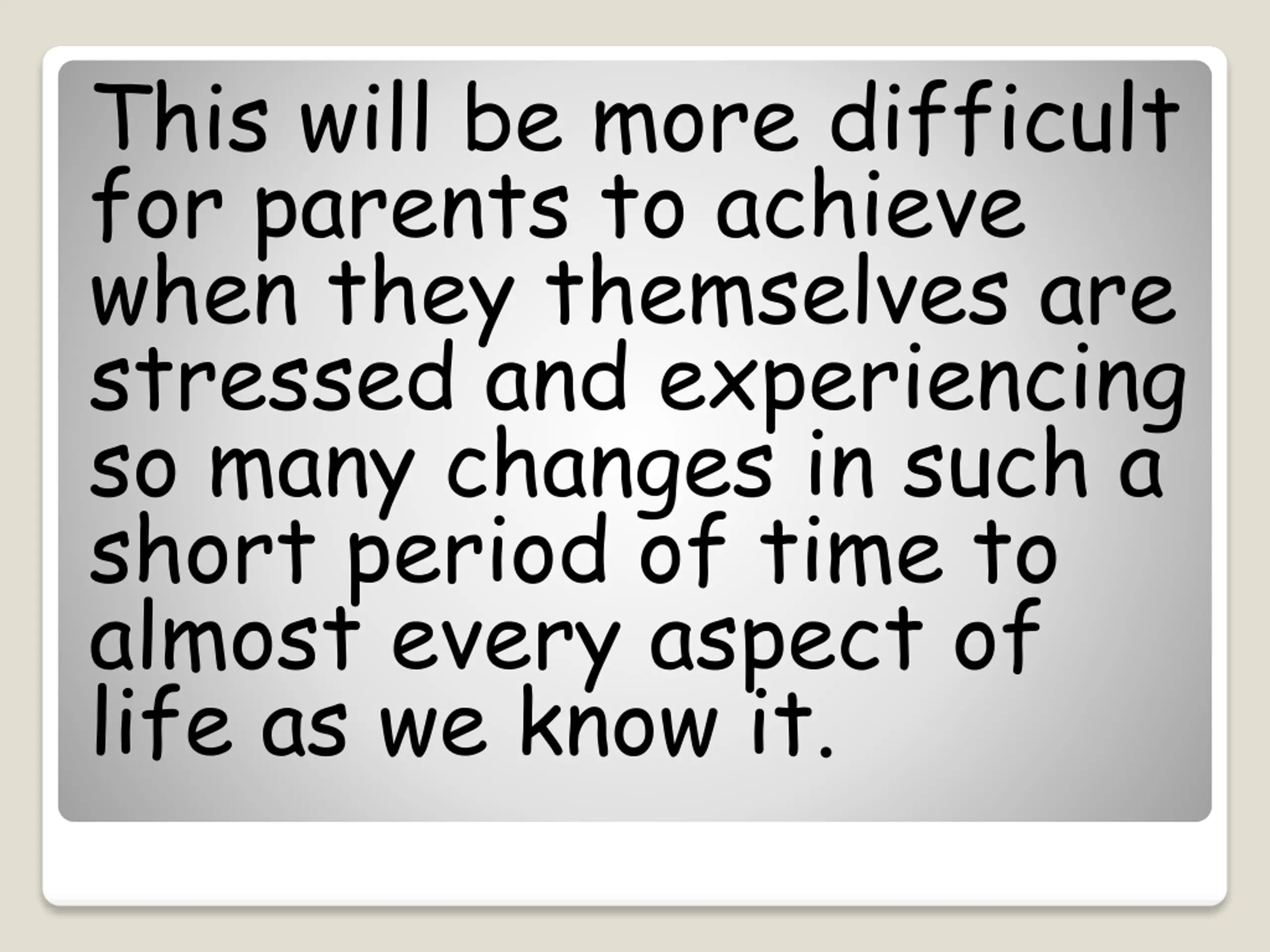 This will be more difficult for parents to achieve when they themselves are stressed and experiencing so many changes in such a short period of time to almost every aspect of life as we know it.