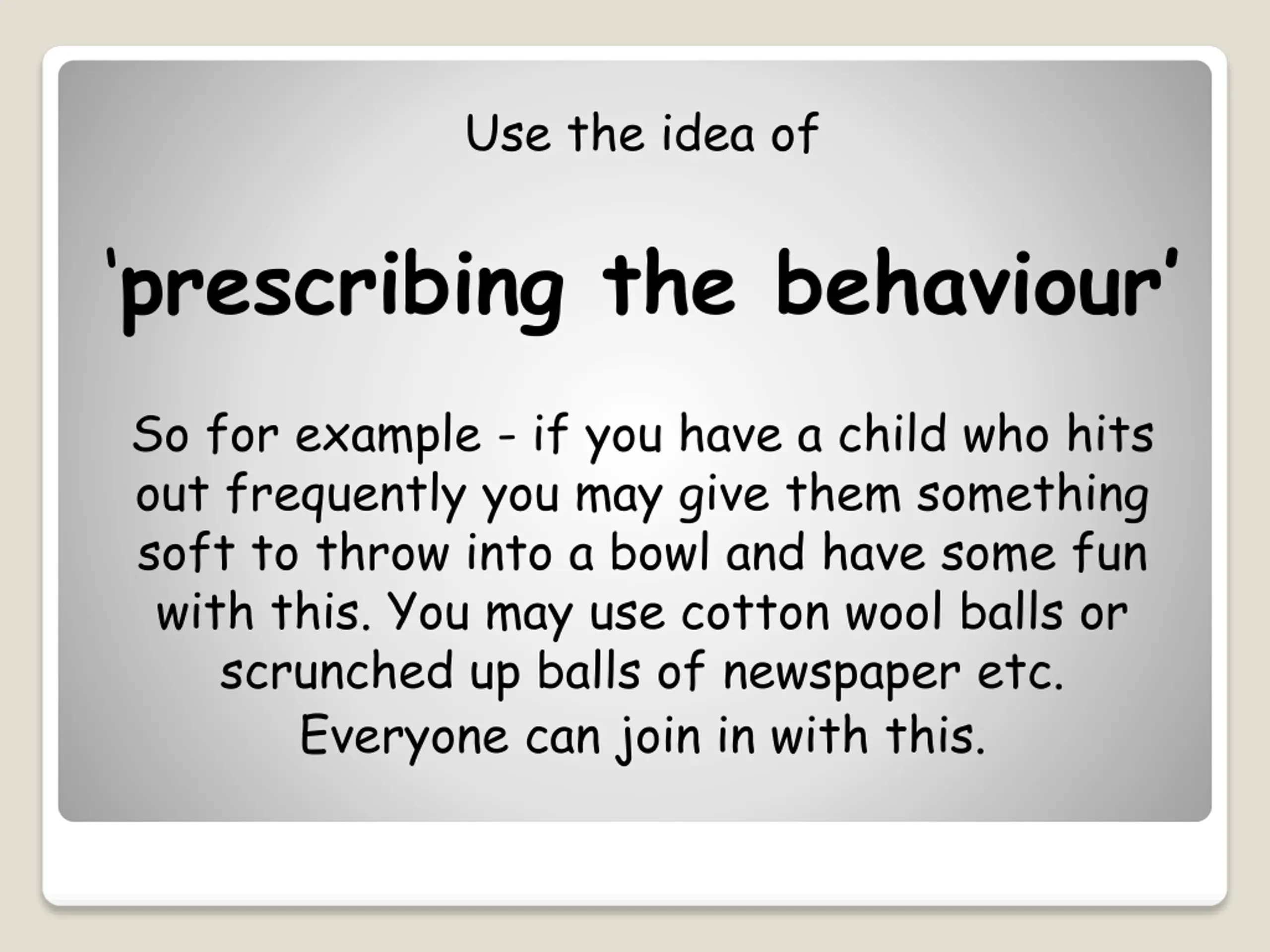 Use the idea of prescribing the behaviour So for example - if you have a child who hits out frequently you may give them something soft to throw into a bowl and have some fun with this. You may use cotton wool balls or scrunched up balls of newspaper etc. Everyone can join in with this.