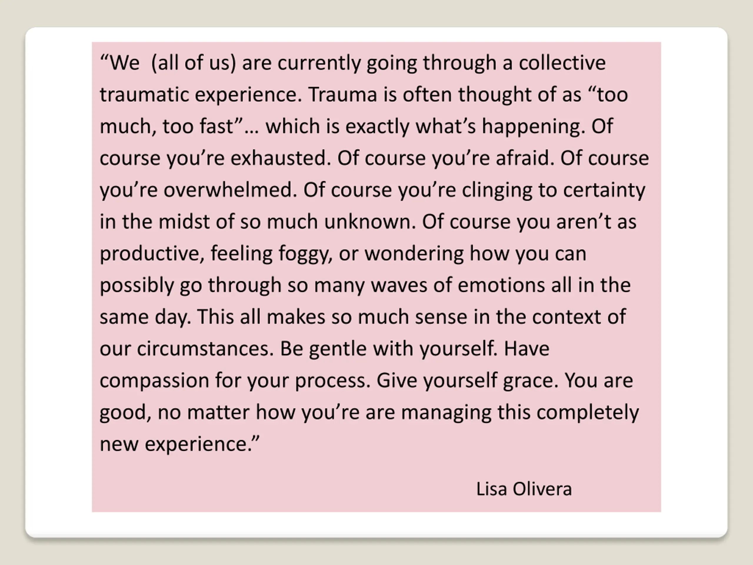 We (all of us) are currently going through a collective traumatic experience. Trauma is often thought of as too much, too fast which is exactly what s happening. Of course you re exhausted. Of course you re afraid. Of course you re overwhelmed. Of course you re clinging to certainty in the midst of so much unknown. Of course you aren t as productive, feeling foggy, or wondering how you can possibly go through so many waves of emotions all in the same day. This all makes so much sense in the context of our circumstances. Be gentle with yourself. Have compassion for your process. Give yourself grace. You are good, no matter how you re are managing this completely new experience. Lisa Olivera