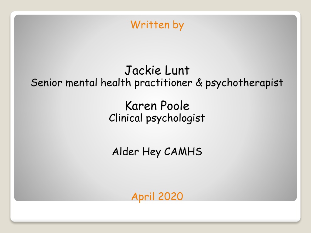 Written by Jackie Lunt Senior mental health practitioner & psychotherapist Karen Poole Clinical psychologist Alder Hey CAMHS April 2020