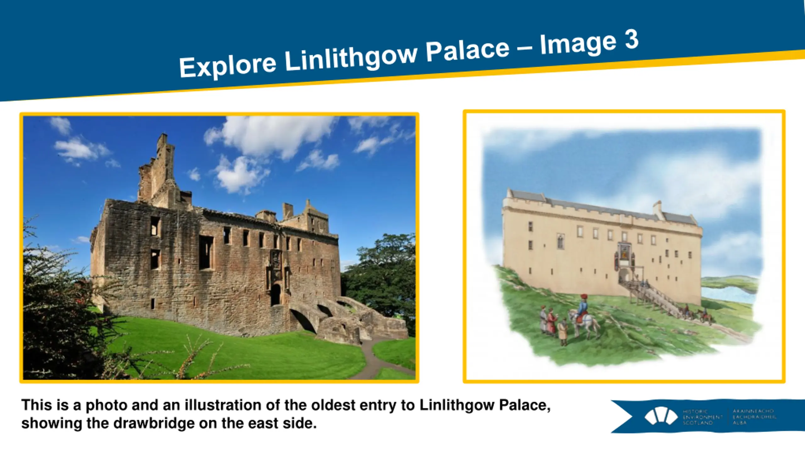 This is a photo and an illustration of the oldest entry to Linlithgow Palace, showing the drawbridge on the east side.